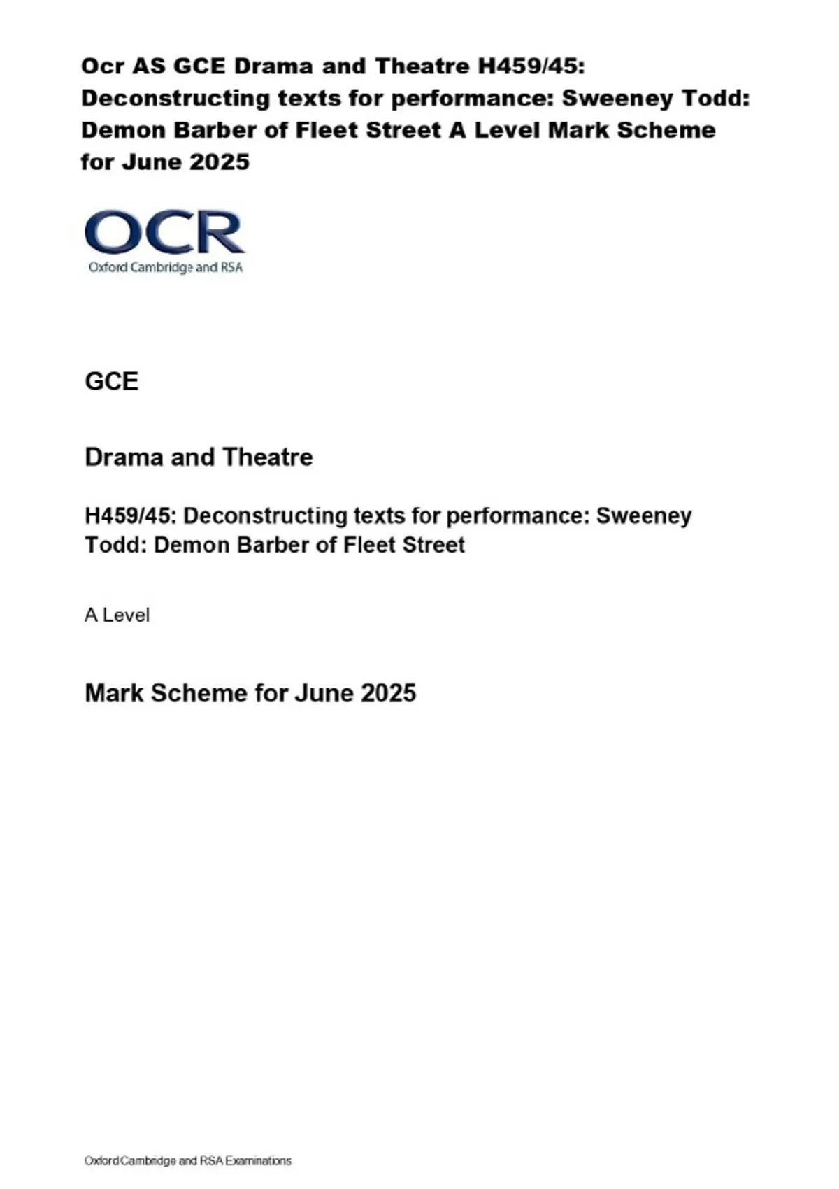 Ocr AS GCE Drama and Theatre H459/45: Deconstructing texts for performance: Sweeney Todd: Demon Barber of Fleet Street A Level Mark Scheme for June 2025