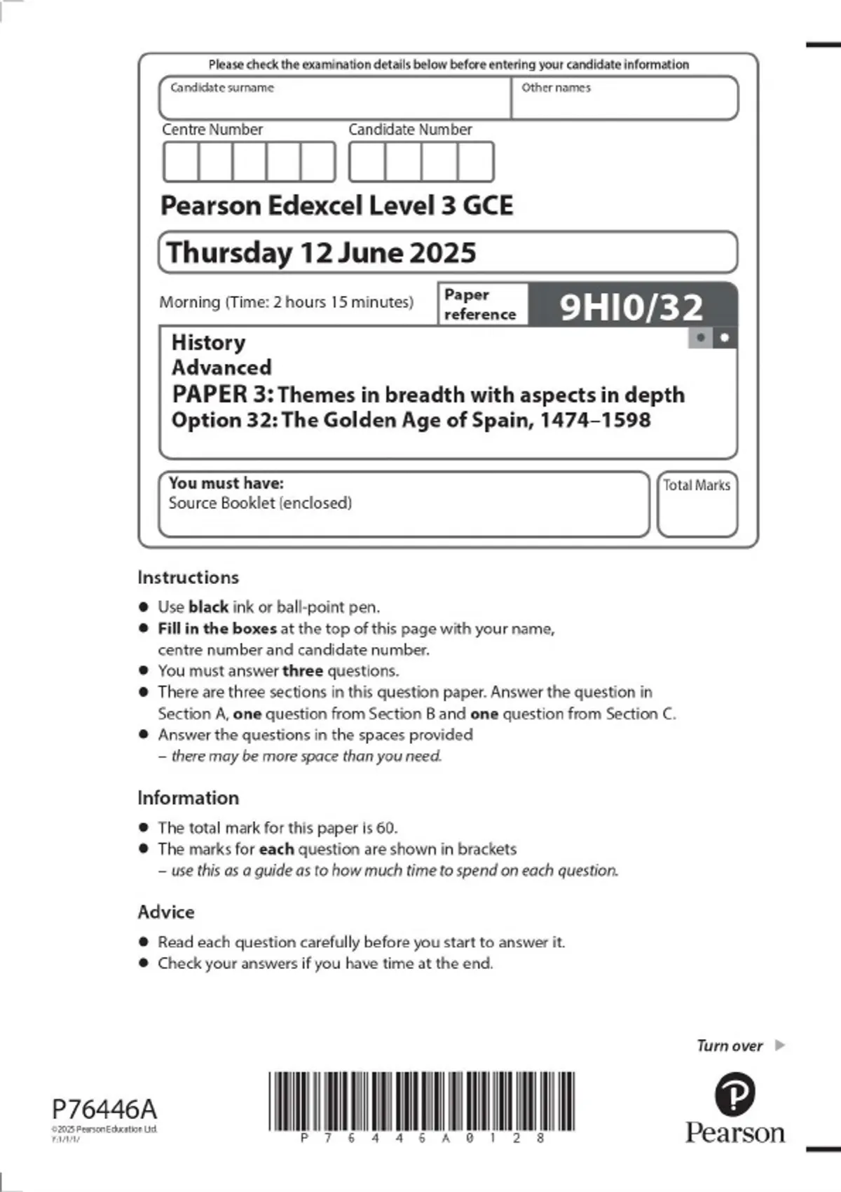 Pearson Edexcel Level 3 GCE HISTORY Advanced PAPER 3: Themes in breadth with aspects in depth Option 32: The Golden Age of Spain, JUNE 2025 Combined Question Paper and Mark Scheme