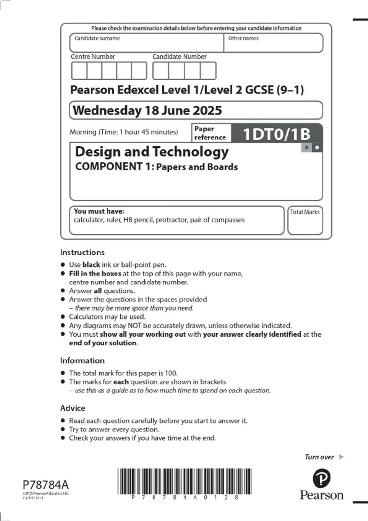 Pearson Edexcel Level 1/Level 2 GCSE (9–1) Design and Technology COMPONENT 1: Papers and Boards JUNE 2025 Combined Question Paper and Mark Scheme