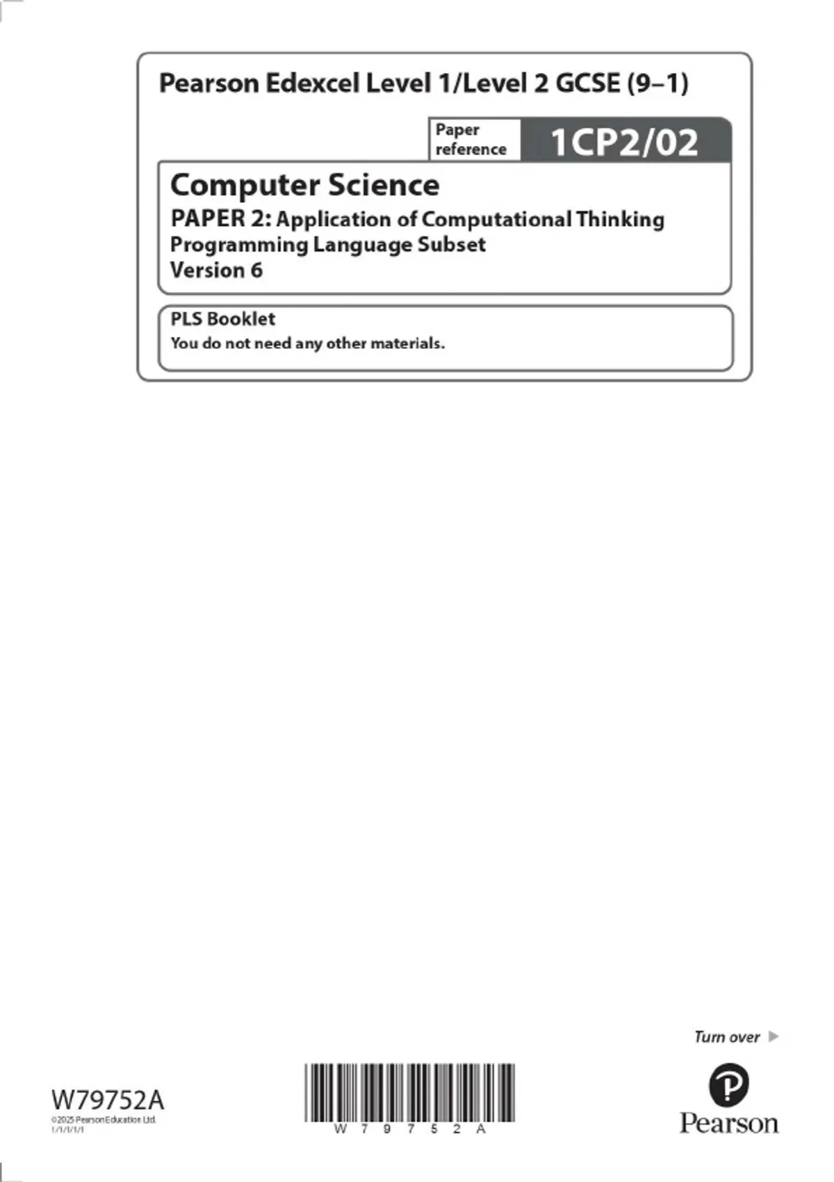 Pearson Edexcel Level 1/Level 2 GCSE (9–1) Computer Science PAPER 2: Application of Computational Thinking Programming Language Subset Version 6 BOOKLET 2025