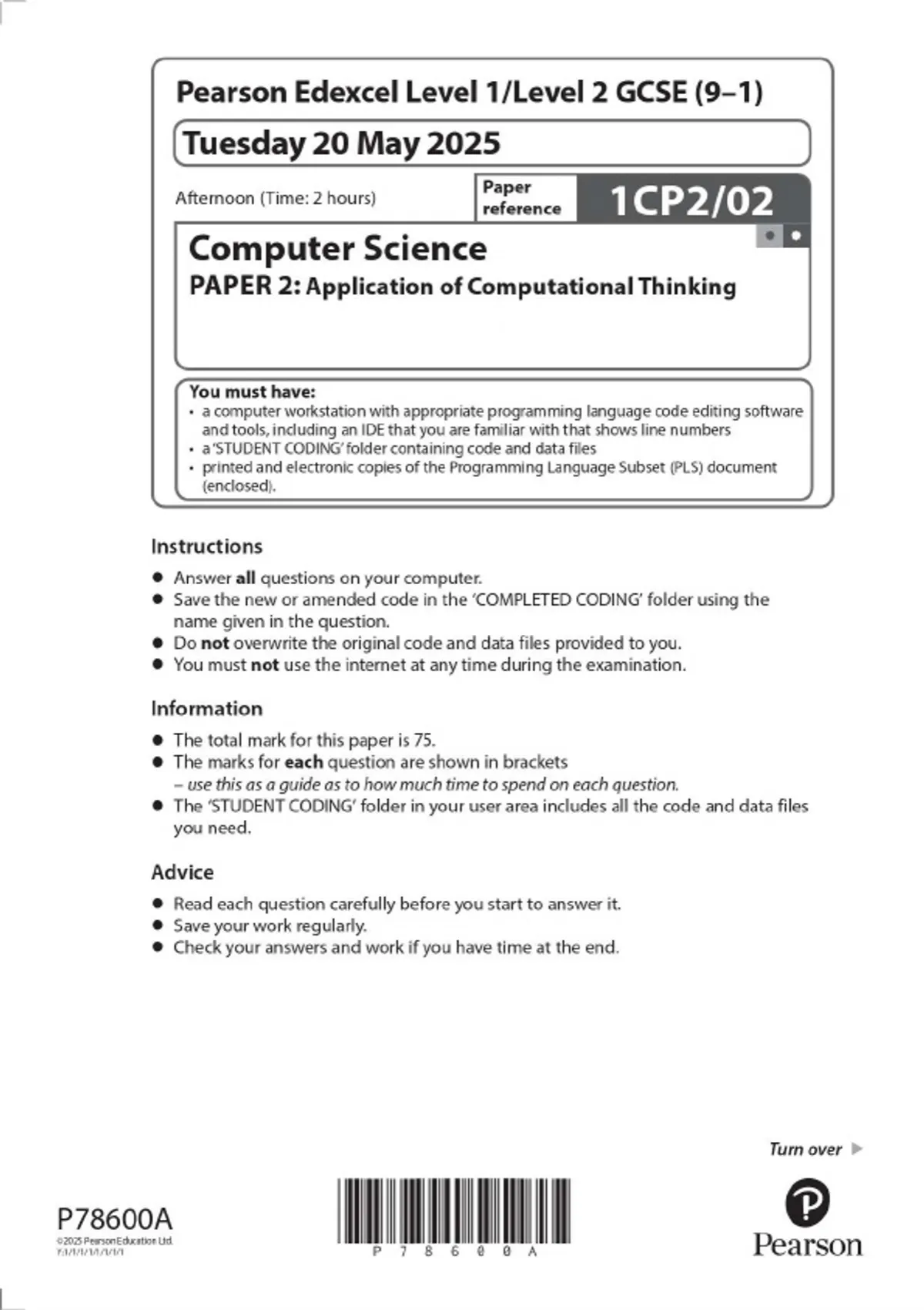 Pearson Edexcel Level 1/Level 2 GCSE (9–1) Computer Science PAPER 2: Application of Computational Thinking MAY 2025 combined Question Paper and Mark scheme