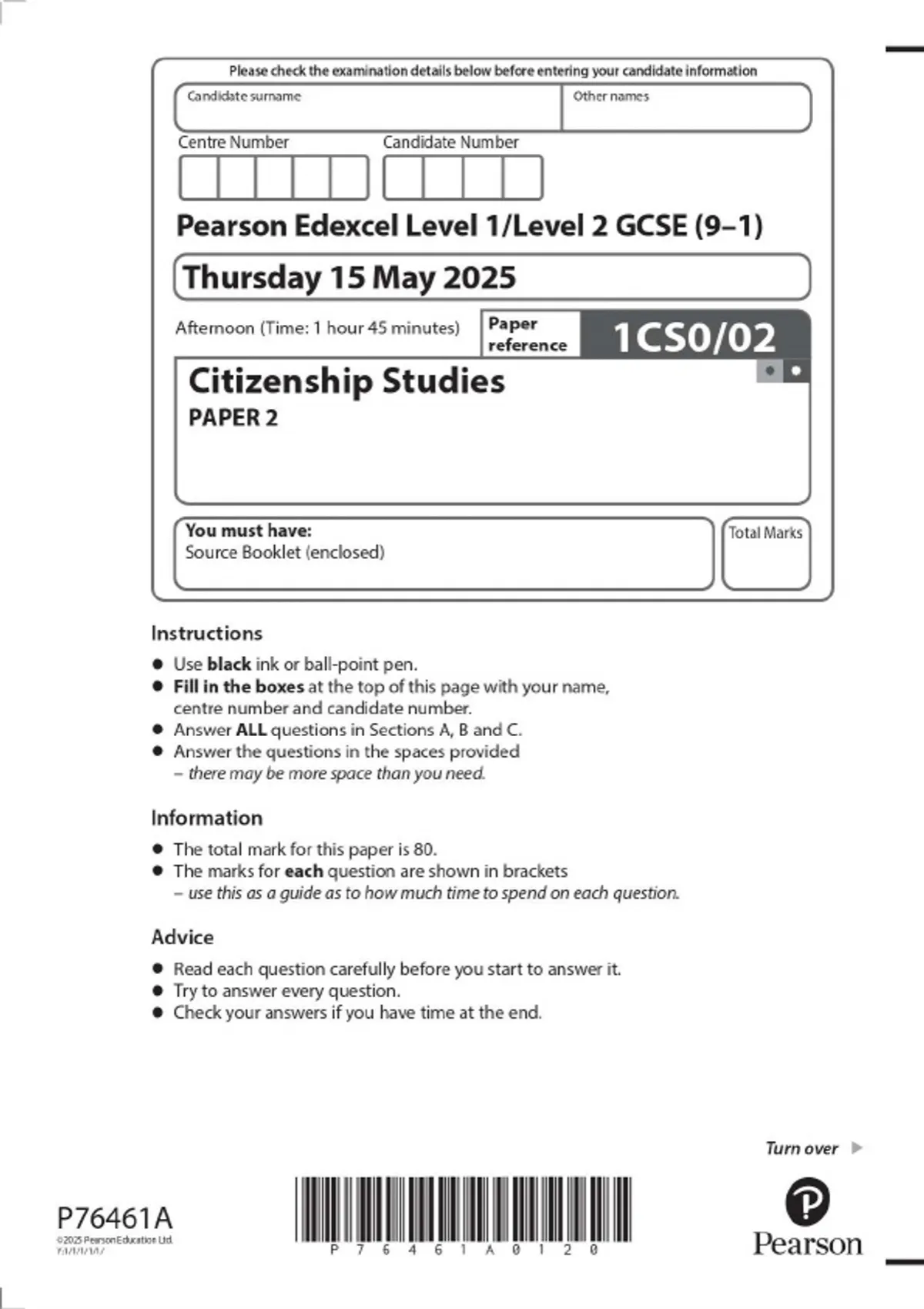 Pearson Edexcel Level 1/Level 2 GCSE (9–1) Citizenship Studies PAPER 2 MAY 2025 combined Question Paper and Mark scheme