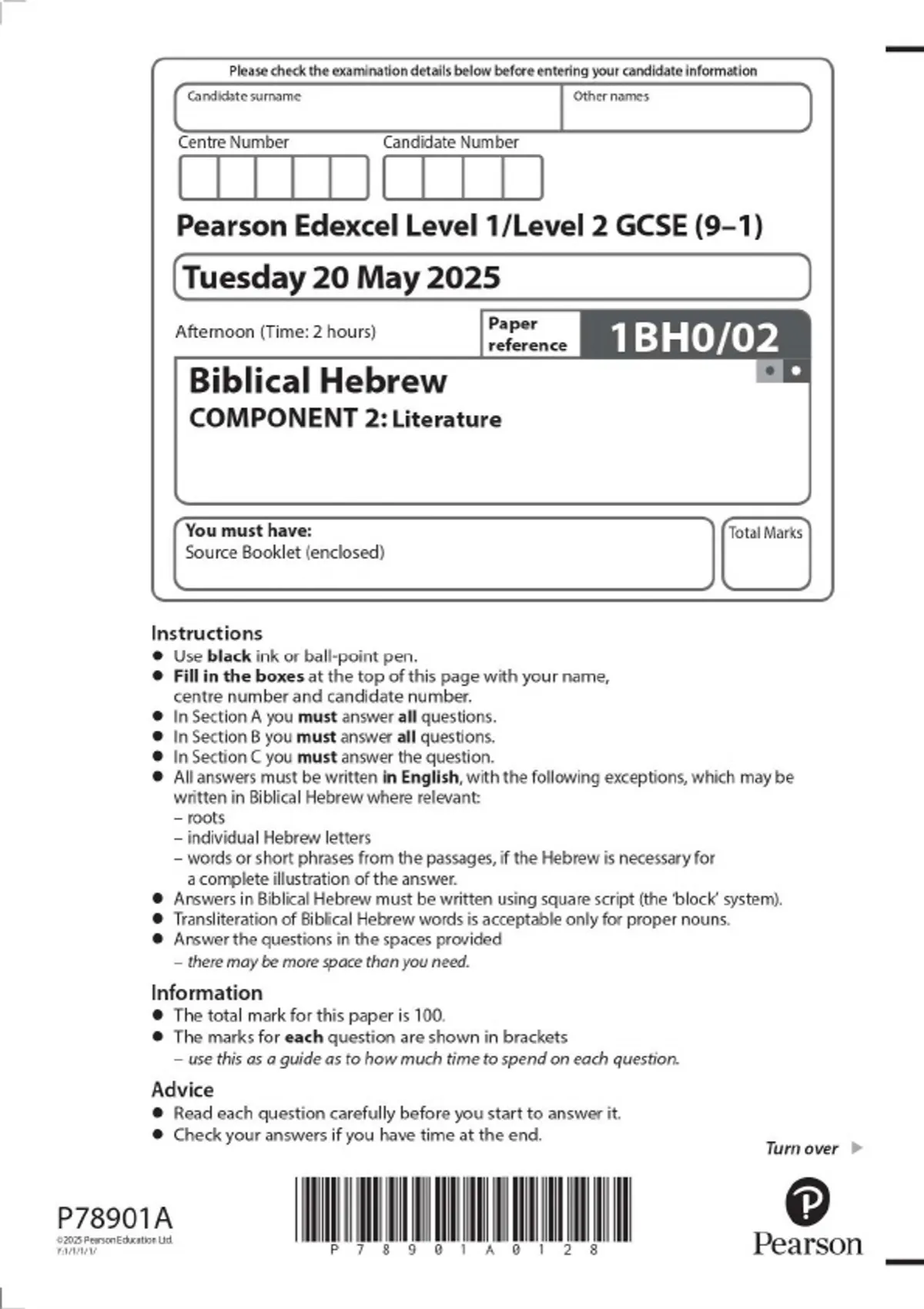 Pearson Edexcel Level 1/Level 2 GCSE (9–1) Biblical Hebrew COMPONENT 2: Literature MAY 2025 combined Question Paper and Mark scheme
