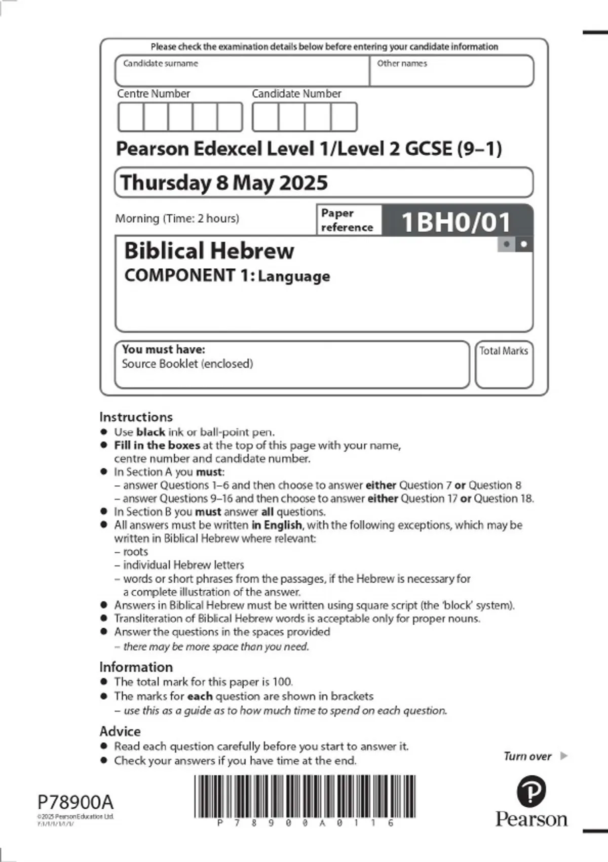 Pearson Edexcel Level 1/Level 2 GCSE (9–1) Biblical Hebrew COMPONENT 1: Language MAY 2025 combined Question Paper and Mark scheme
