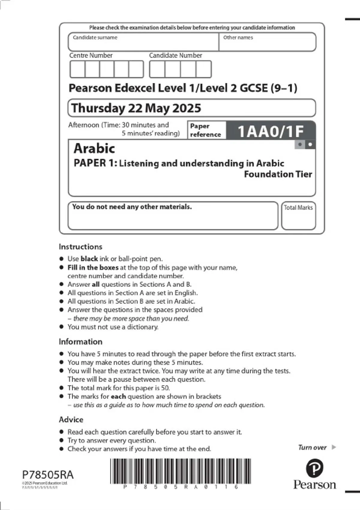 Pearson Edexcel Level 1/Level 2 GCSE (9–1) Arabic PAPER 1: Listening and understanding in Arabic Foundation Tier MAY 2025 combined Question Paper and Mark scheme