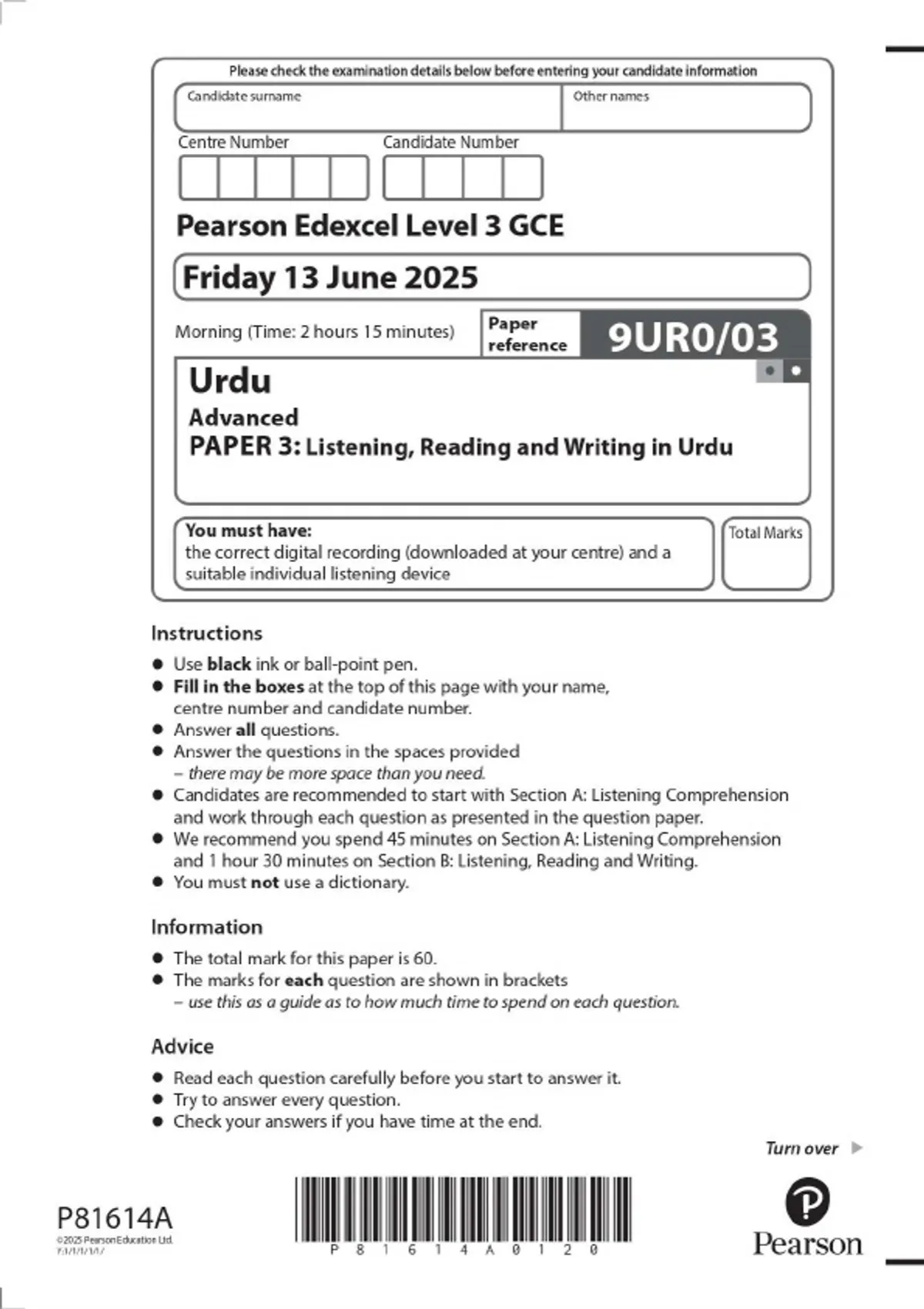 Pearson Edexcel Level 3 GCE Urdu Advanced PAPER 3: Listening, Reading and Writing in Urdu 2025 combined Question Paper and Mark scheme