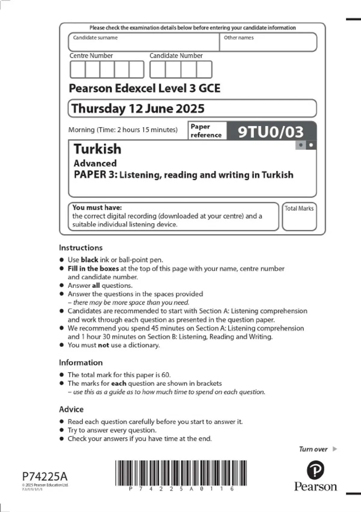 Pearson Edexcel Level 3 GCE Turkish Advanced PAPER 3: Listening, reading and writing in Turkish JUNE 2025 combined Question Paper and Mark scheme
