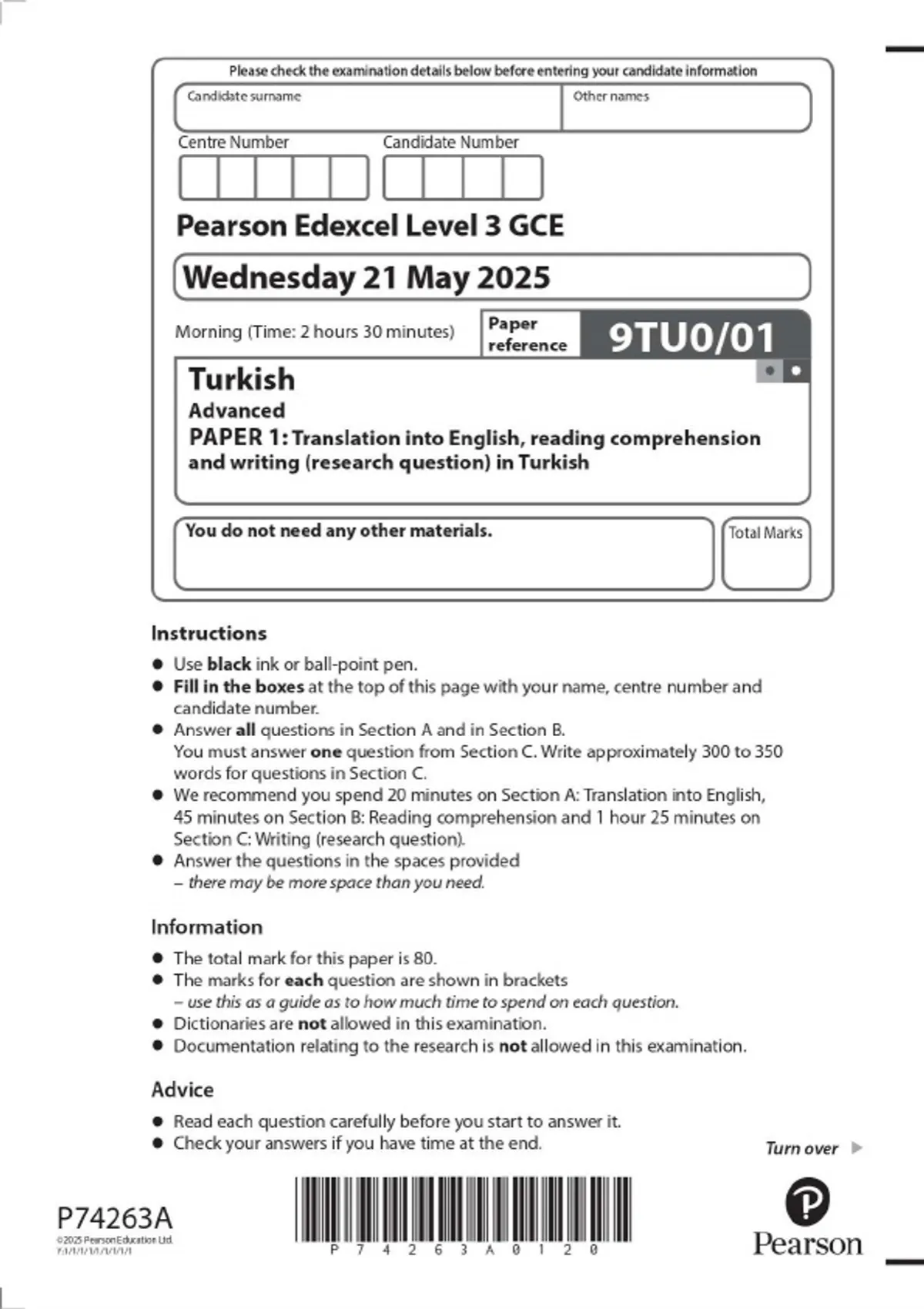 Pearson Edexcel Level 3 GCE Turkish Advanced PAPER 1: Translation into English, reading comprehension and writing (research question) in Turkish MAY 2025 combined Question Paper and Mark scheme