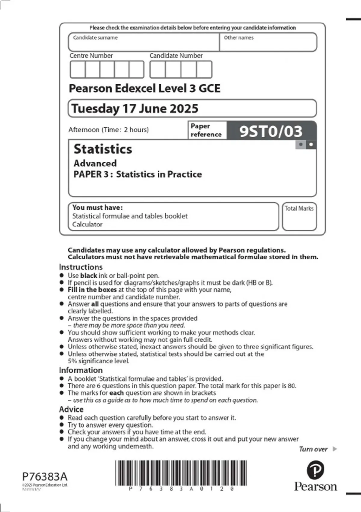 Pearson Edexcel Level 3 GCE Statistics Advanced PAPER 3 : Statistics in Practice JUNE 2025 combined Question Paper and Mark scheme