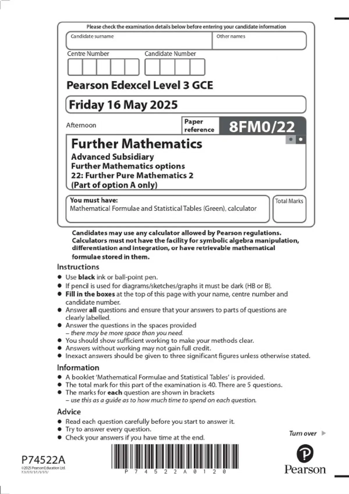 Pearson Edexcel Level 3 GCE Further Mathematics Advanced Subsidiary Further Mathematics options 22: Further Pure Mathematics 2 (Part of option A only) MAY 2025 Combined Question Paper and Mark Scheme