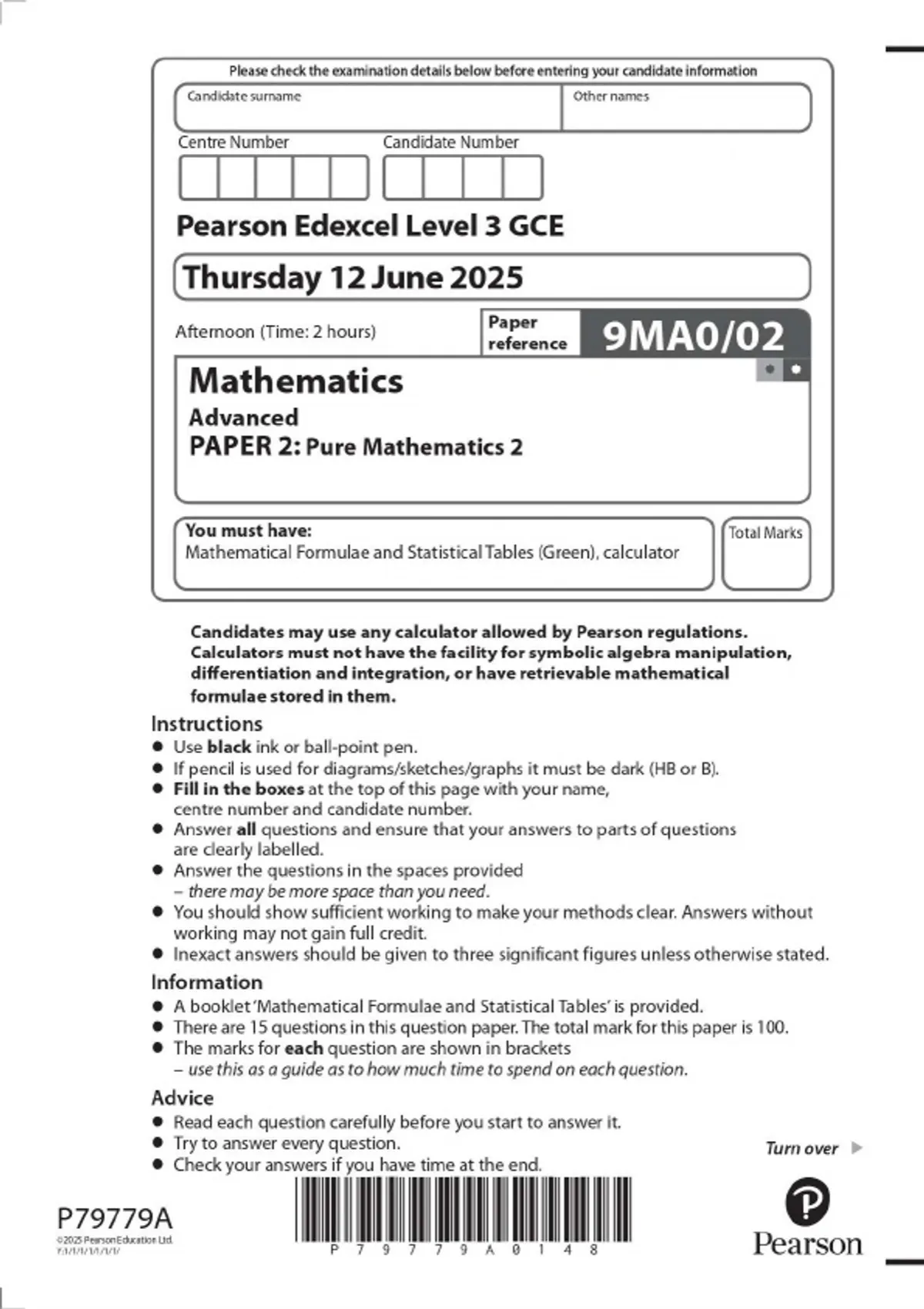 Pearson Edexcel Level 3 GCE Mathematics Advanced PAPER 2: Pure Mathematics 2 JUNE 2025 Combined Question Paper and Mark Scheme