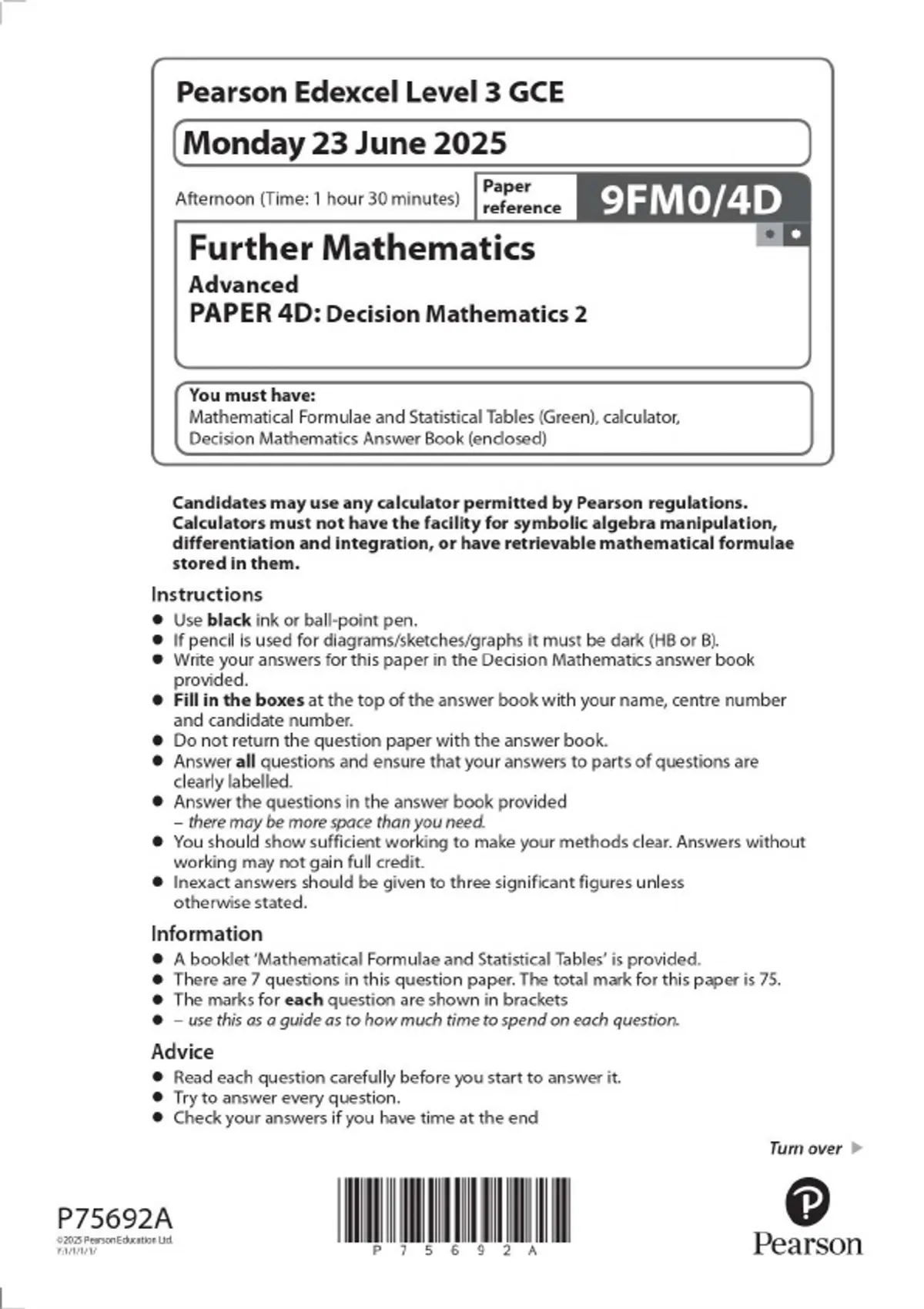 Pearson Edexcel Level 3 GCE Further Mathematics Advanced PAPER 4D: Decision Mathematics 2 JUNE 2025 Combined Question Paper and Mark Scheme