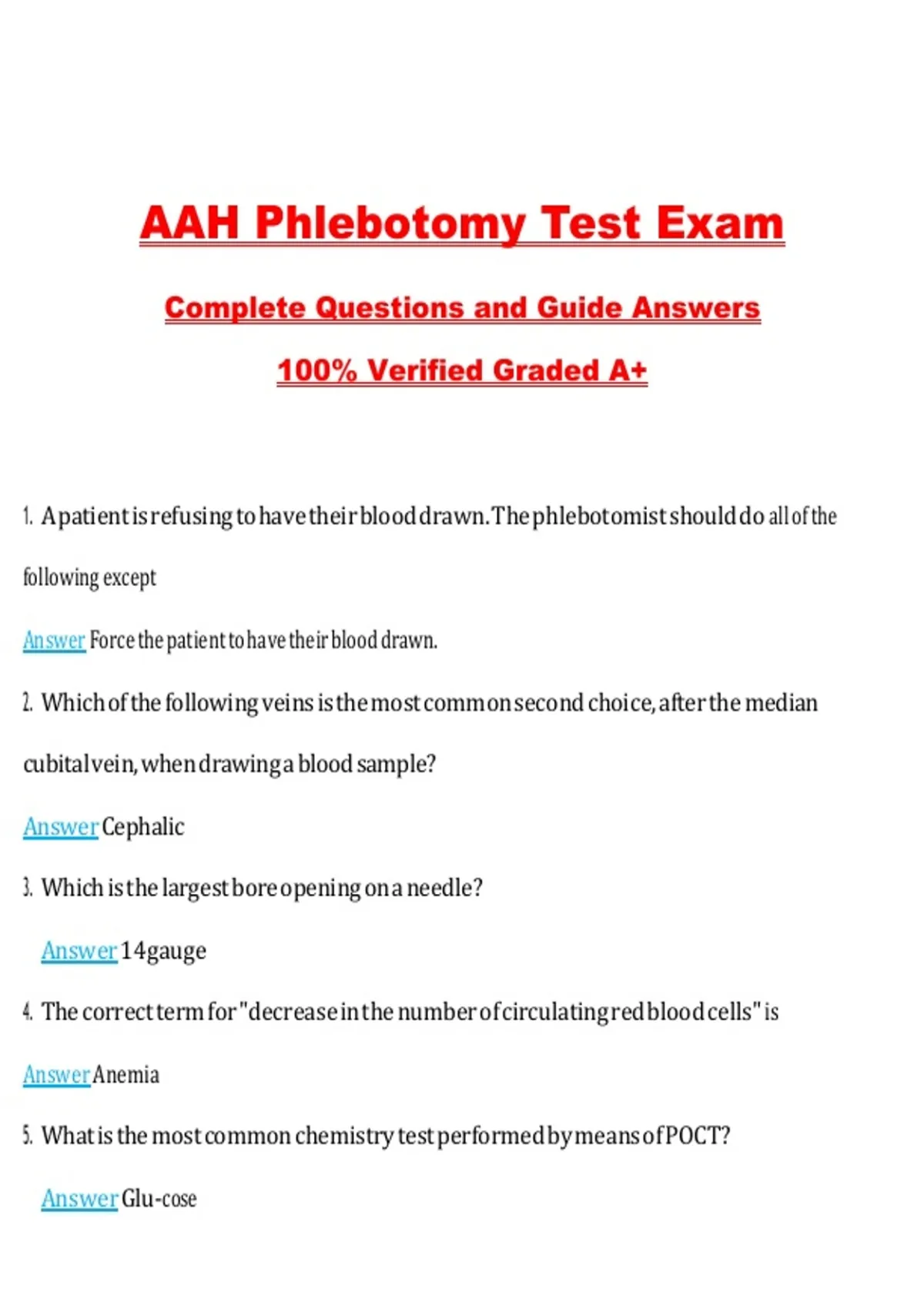 AAH Phlebotomy Test Exam Questions with Correct Answers Pass the Exam, 100% Verified (2026 / 2027) Graded A+ Ace the AAH Phlebotomy Test Exam 2026 with Insider Secrets! Stop guessing and start passing with confidence! This ultimate PDF study guide includes actual phlebotomy exam questions, verified answers, and insider tips that other study materials don’t provide. Perfect for first-time test-takers or those retaking the exam, this guide is your shortcut to success. REAL exam questions & verified answers – know exactly what to expect Step-by-step strategies for fast, effective studying Instant PDF download – study anytime, anywhere Guaranteed pass approach for 2026 Perfect for last-minute prep or complete exam mastery AAH Phlebotomy Test Exam, AAH phlebotomy study guide, phlebotomy practice questions, phlebotomy exam 2026 PDF, AAH exam answers, instant download exam, guaranteed pass phlebotomy, AAH test prep, certified phlebotomy exam, phlebotomy certification guide, AAH exam prep PDF, phlebotomy test questions, phlebotomy exam success, AAH study PDF, phlebotomy certification exam