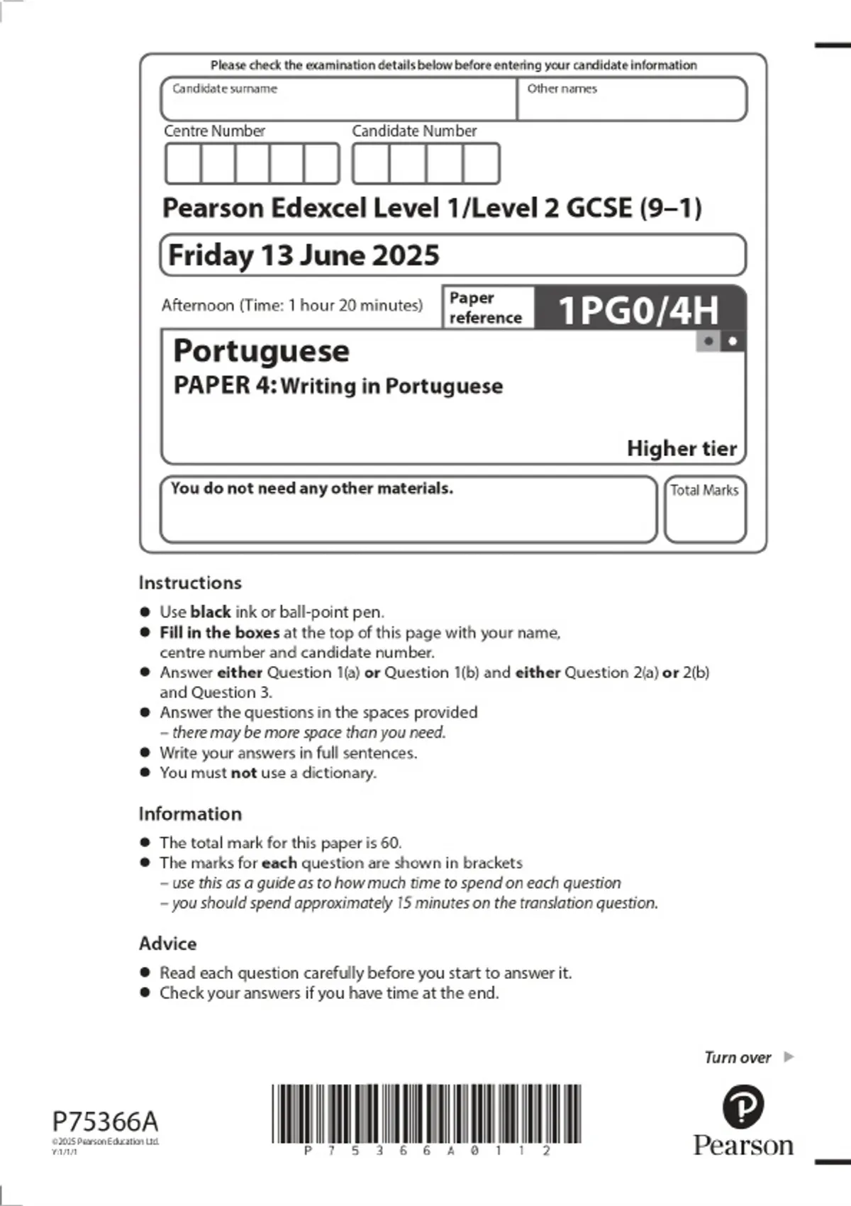 2025 Pearson Edexcel Level 1/Level 2 GCSE (9–1) Portuguese PAPER 4: Writing in Portuguese Higher tier Combined Question Paper and Marking Scheme