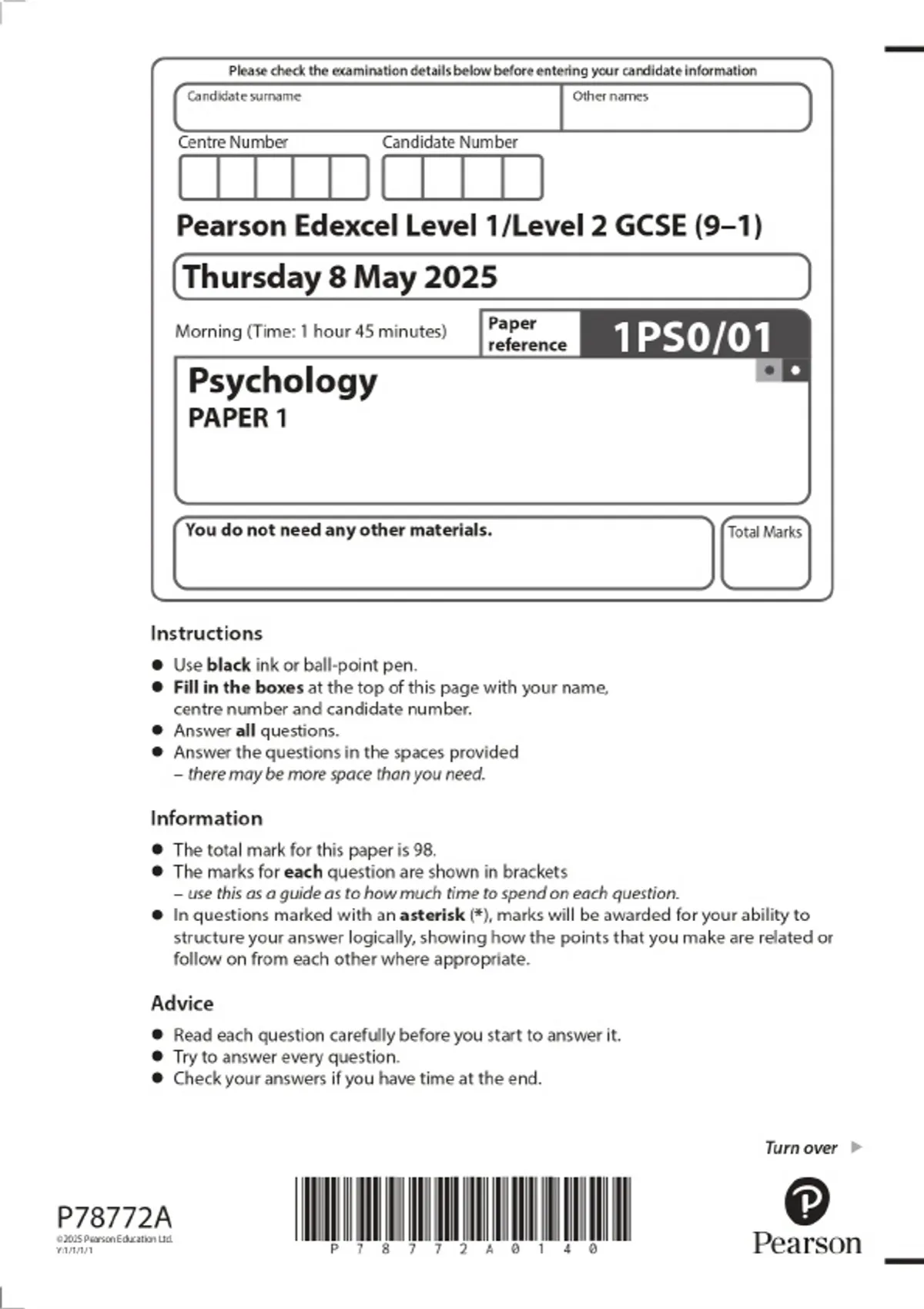 2025 Pearson Edexcel Level 1/Level 2 GCSE (9–1) Psychology PAPER 1 Combined Question Paper and Marking Scheme