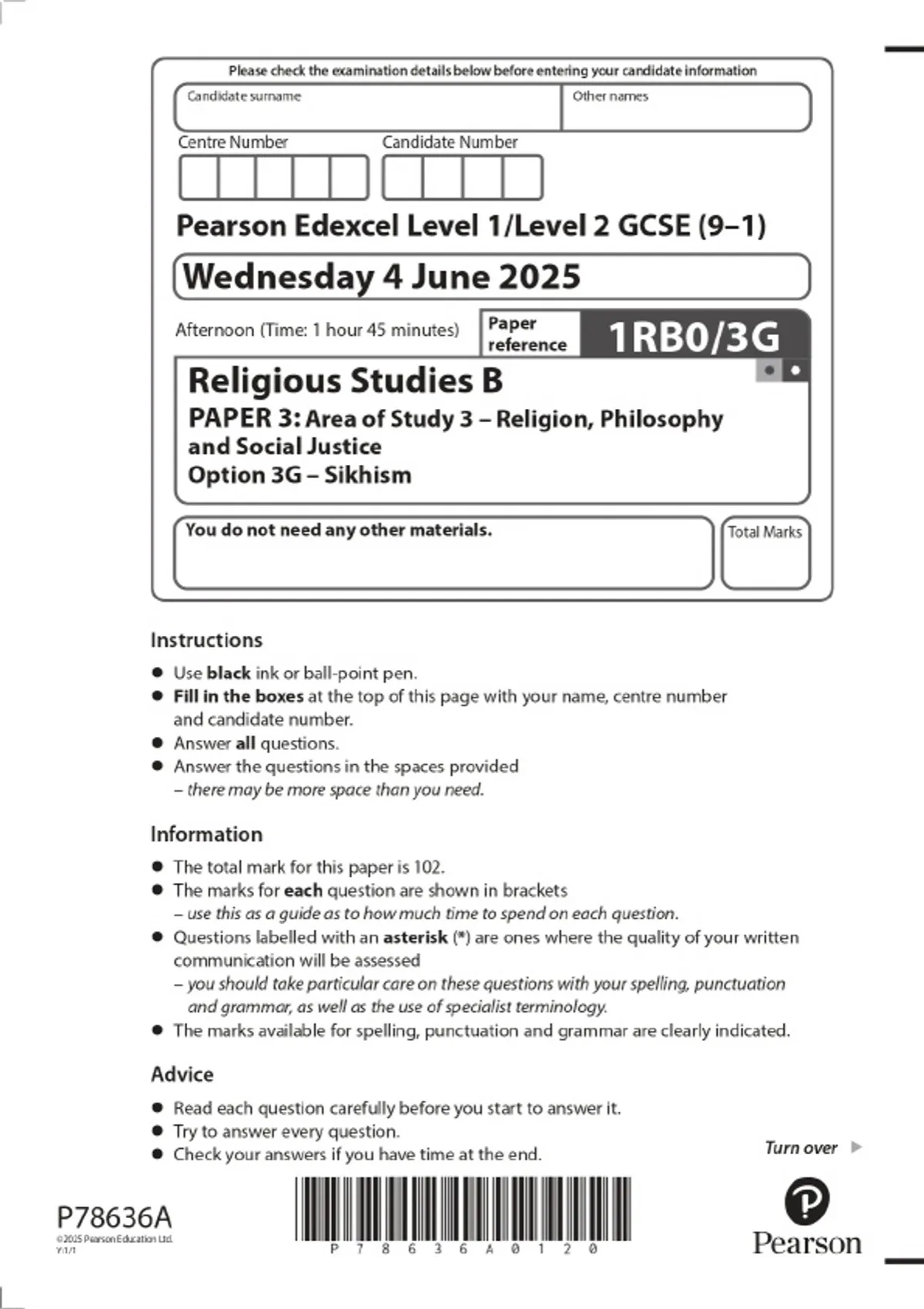 2025 Pearson Edexcel Level 1/Level 2 GCSE (9–1) Religious Studies B PAPER 3: Area of Study 3 – Religion, Philosophy and Social Justice Option 3G – Sikhism Combined Question Paper and Marking Scheme