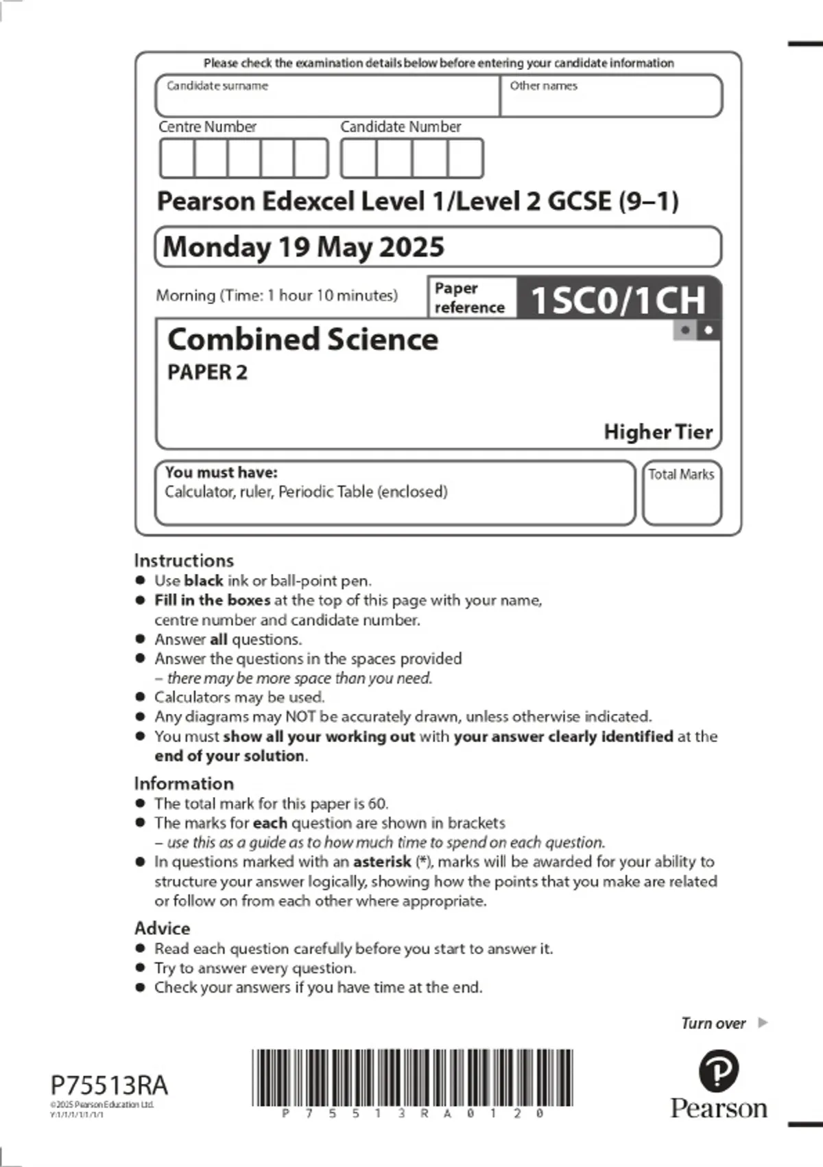 2025 Pearson Edexcel Level 1/Level 2 GCSE (9–1) Combined Science PAPER 2 Higher Tier Combined Question Paper and Marking Scheme