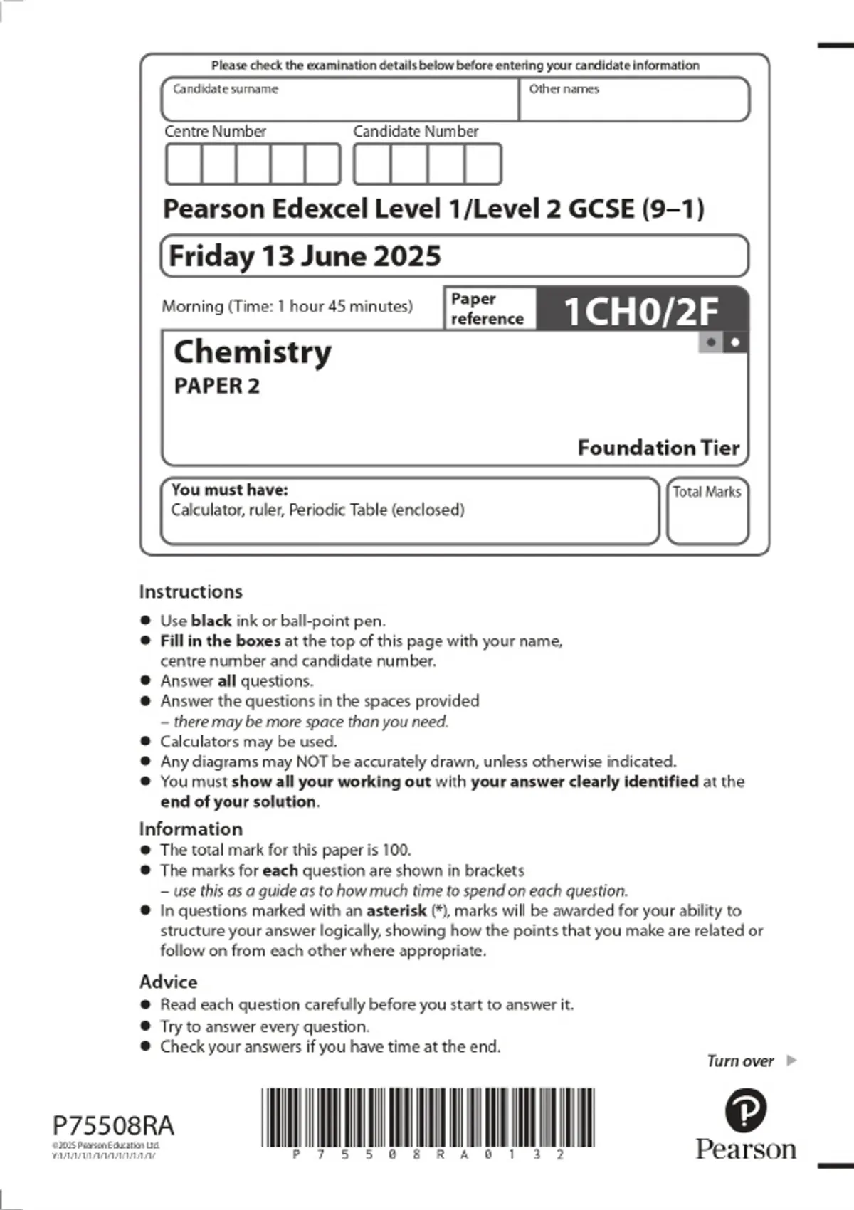 2025 Pearson Edexcel Level 1/Level 2 GCSE (9–1) Chemistry PAPER 2 Foundation Tier Combined Question Paper and Marking Scheme