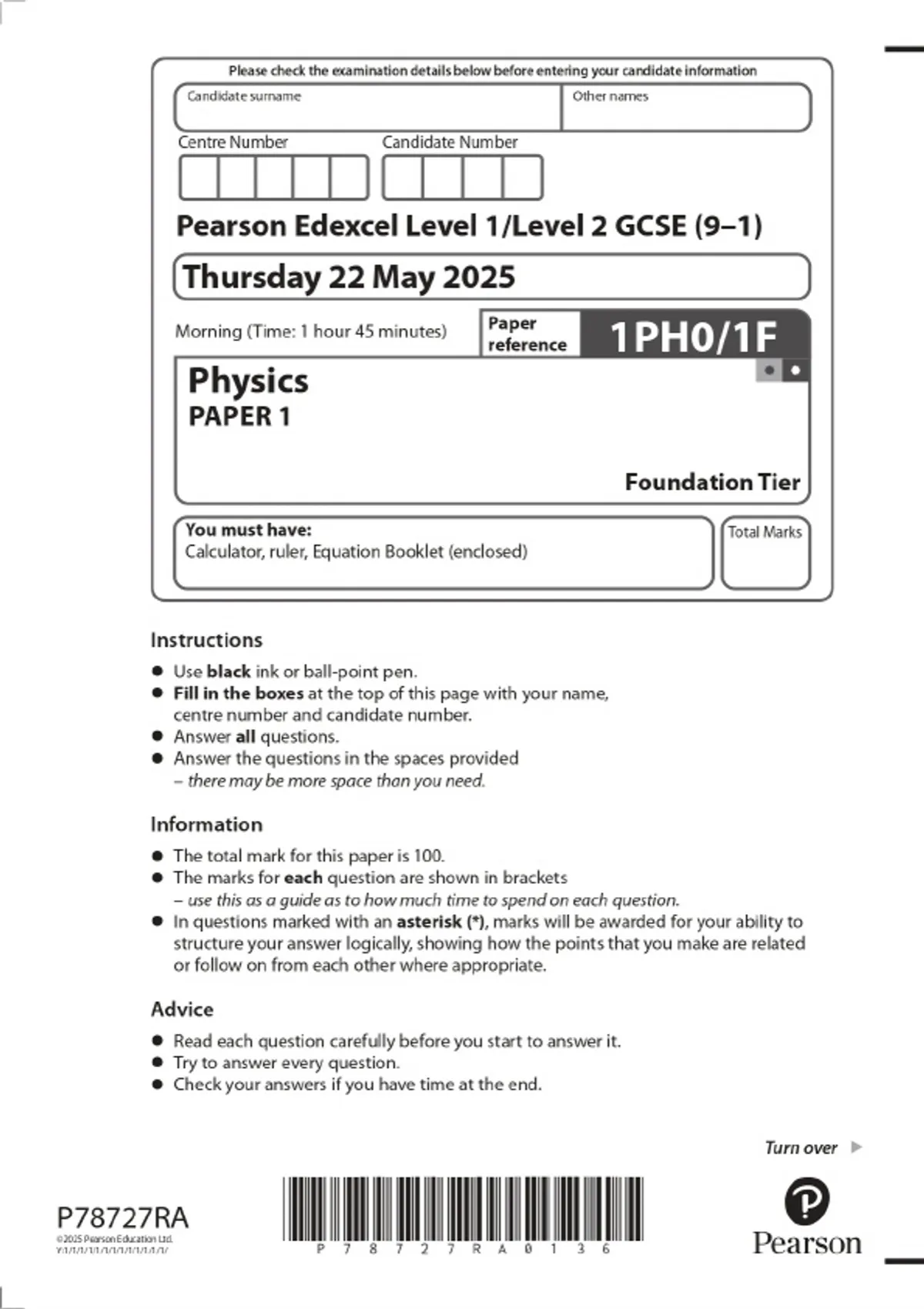 2025 Pearson Edexcel Level 1/Level 2 GCSE (9–1) Physics PAPER 1 Foundation Tier Combined Question Paper and Marking Scheme