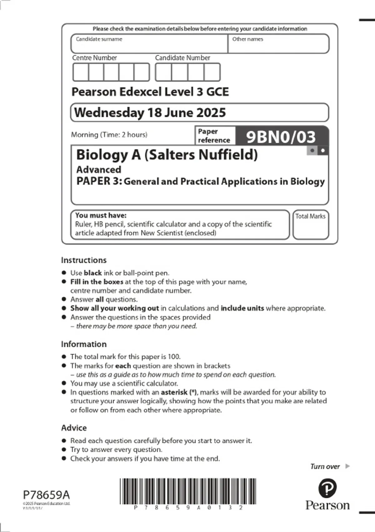 2025 Pearson Edexcel Level 3 GCE Biology A {Salters Nuffield} Advanced PAPER 3: General and Practical Applications in Biology Combined Question Paper and Marking Scheme