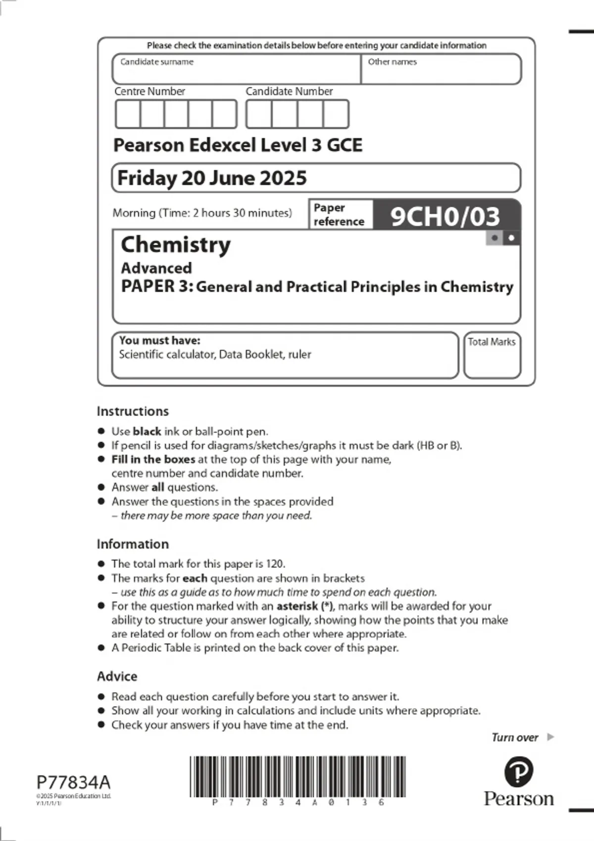 2025 Pearson Edexcel Level 3 GCE Chemistry Advanced PAPER 3: General and Practical Principles in Chemistry Combined Question Paper and Marking Scheme