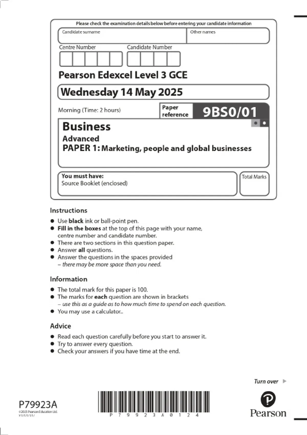 2025 Pearson Edexcel Level 3 GCE Business Advanced PAPER 1: Marketing, people and global businesses Combined Question Paper and Marking Scheme