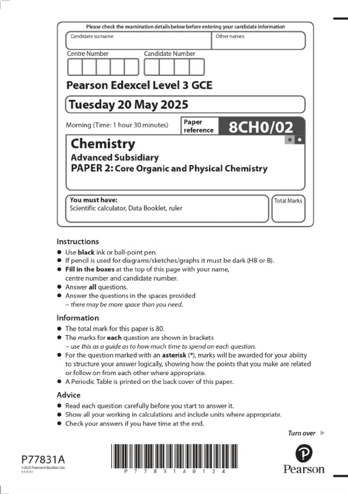 2025 Pearson Edexcel Level 3 GCE Chemistry Advanced Subsidiary PAPER 2: Core Organic and Physical Chemistry Combined Question Paper and Marking Scheme