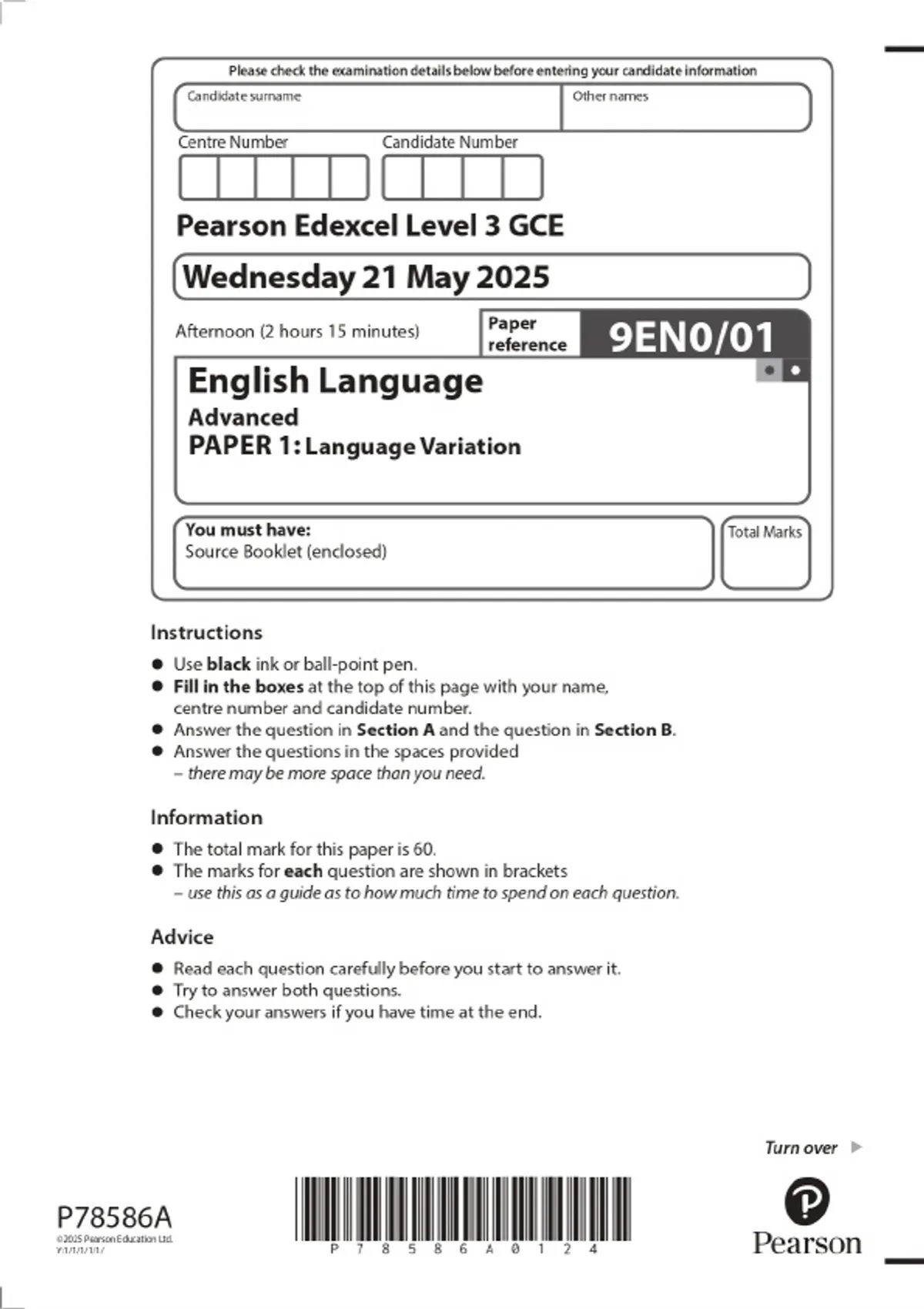2025 Pearson Edexcel Level 3 GCE English Language Advanced PAPER 1: Language Variation Combined Question Paper and Marking Scheme