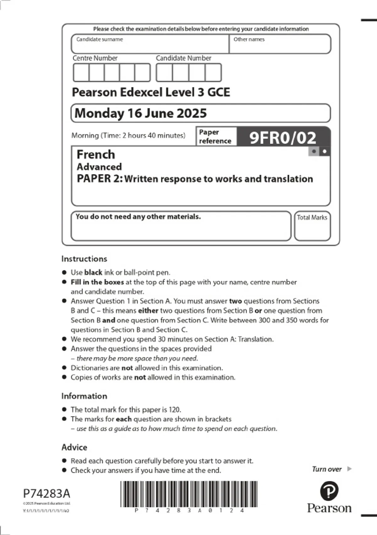2025 Pearson Edexcel Level 3 GCE French Advanced PAPER 2: Written response to works and translation Combined Question Paper and Marking Scheme