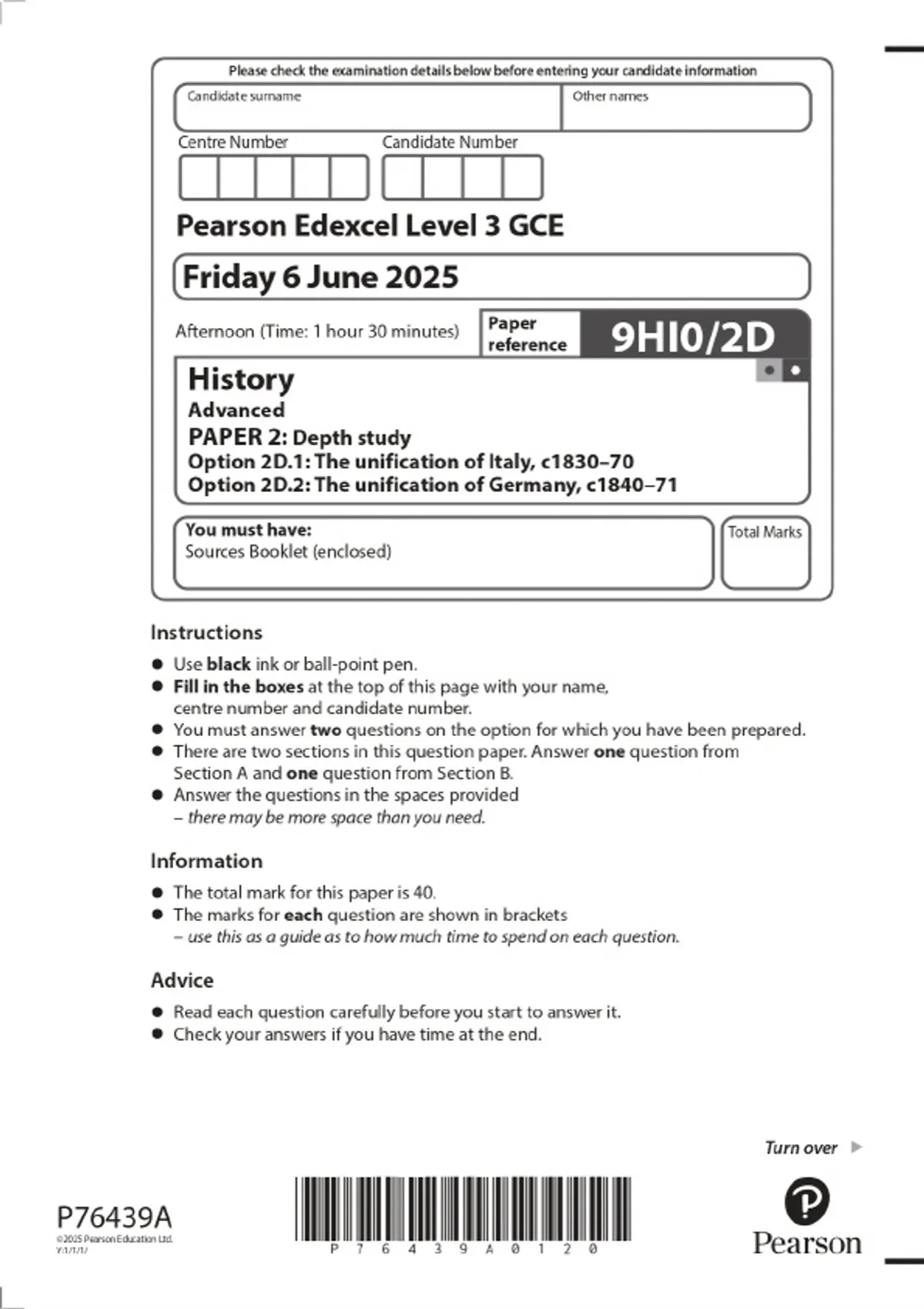 2025 Pearson Edexcel Level 3 GCE History Advanced PAPER 2: Depth study Option 2D.1: The unification of Italy, c1830–70 Option 2D.2: The unification of Germany, c1840–71 Combined Question Paper and Marking Scheme