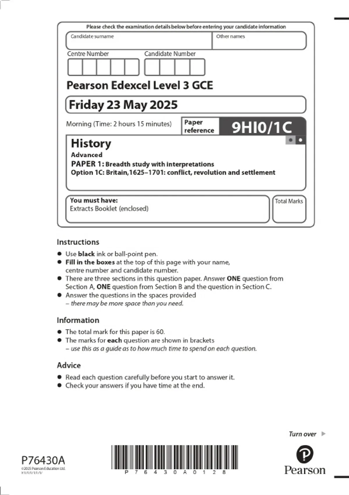 2025 Pearson Edexcel Level 3 GCE History Advanced PAPER 1: Breadth study with interpretations Option 1C: Britain,1625–1701: conflict, revolution and settlement Combined Question Paper and Marking Scheme