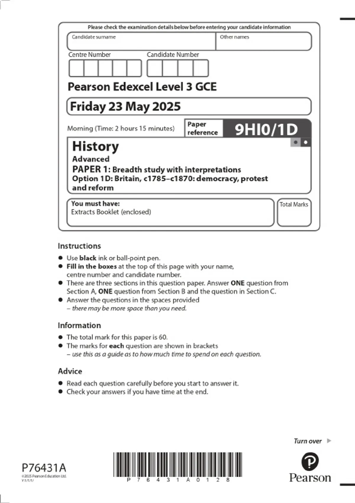 2025 Pearson Edexcel Level 3 GCE History Advanced PAPER 1: Breadth study with interpretations Option 1D: Britain, c1785–c1870: democracy, protest and reform Combined Question Paper and Marking Scheme
