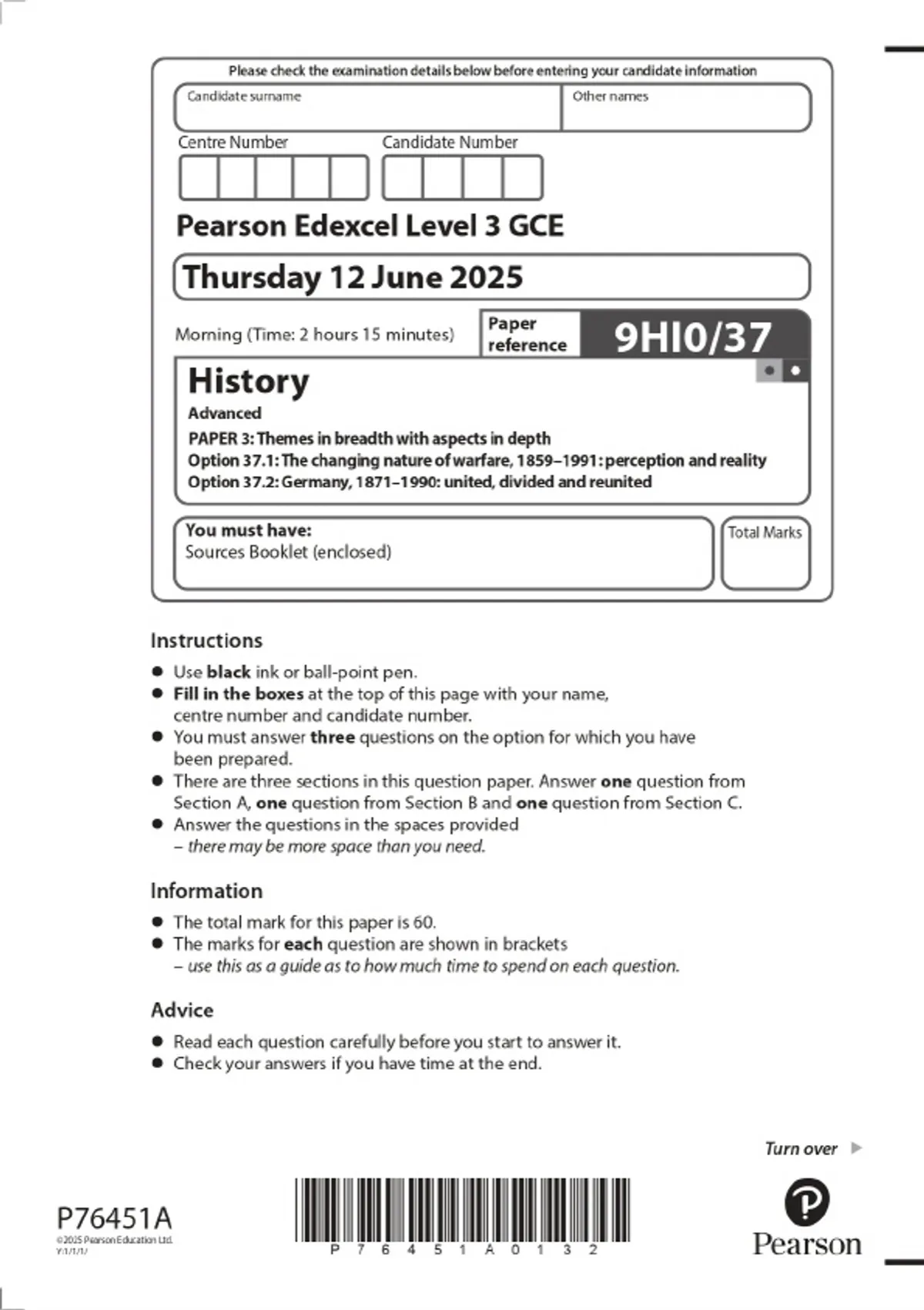2025 Pearson Edexcel Level 3 GCE History Advanced PAPER 3: Themes in breadth with aspects in depth Option 37.1: The changing nature of warfare, 1859–1991: perception and reality Option 37.2: Germany, 1871–1990: united, divided and reunited Combined Quest