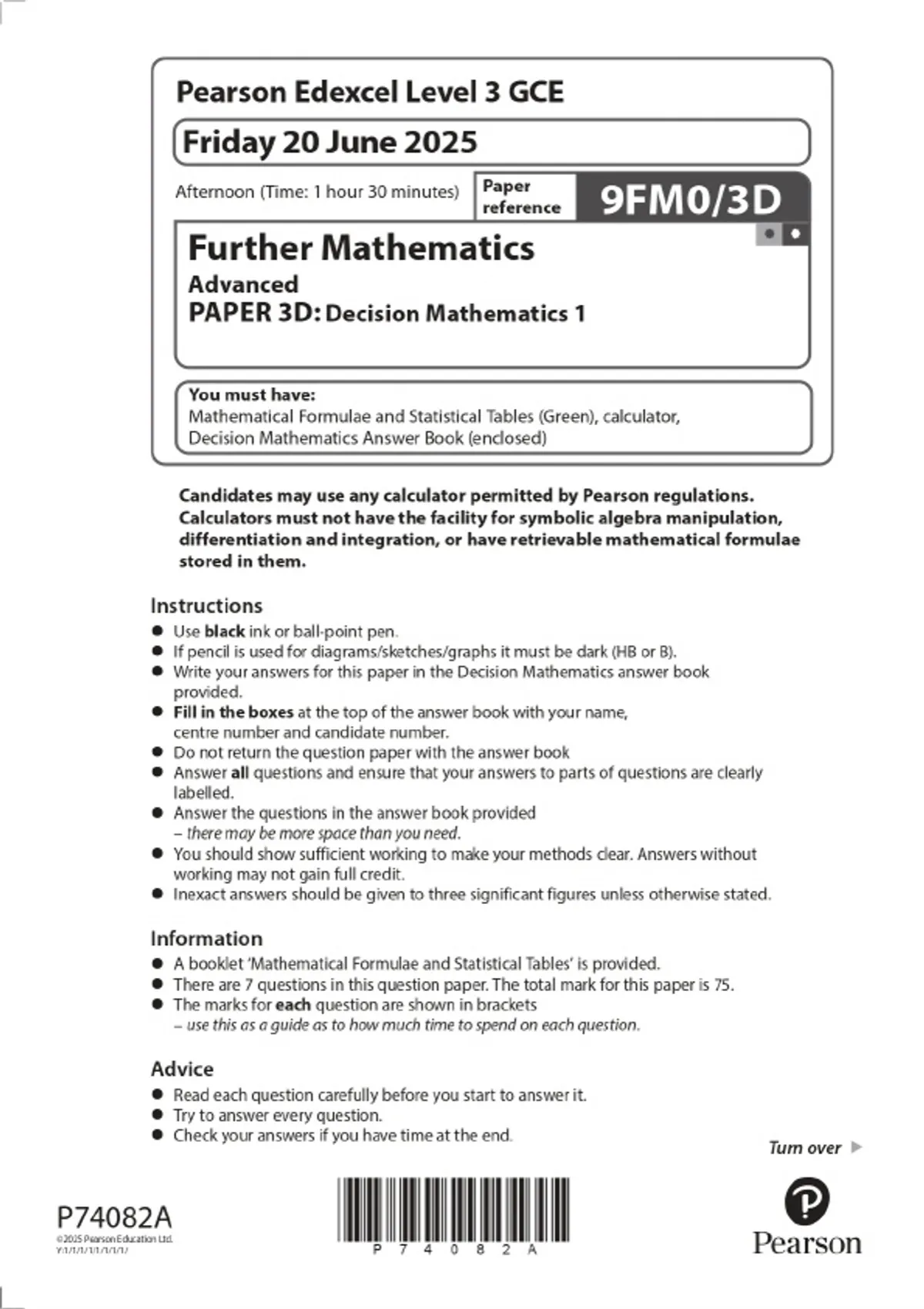 2025 Pearson Edexcel Level 3 GCE Further Mathematics 2025 Pearson Edexcel Level 3 GCE Further Mathematics Advanced PAPER 3D: Decision Mathematics 1 Combined Question Paper and Marking Scheme