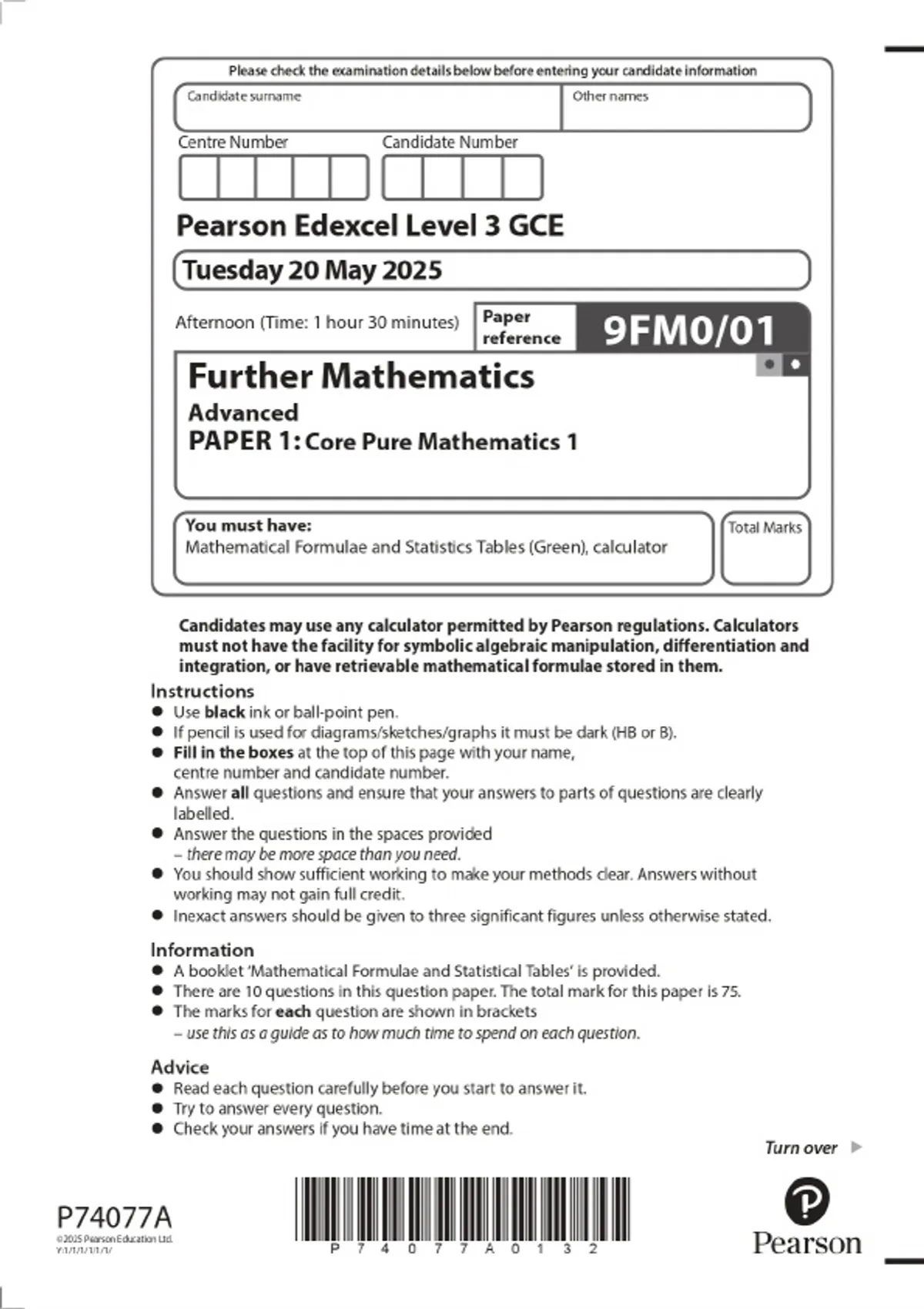 2025 Pearson Edexcel Level 3 GCE Further Mathematics Advanced PAPER 1: Core Pure Mathematics 1 Combined Question Paper and Marking Scheme