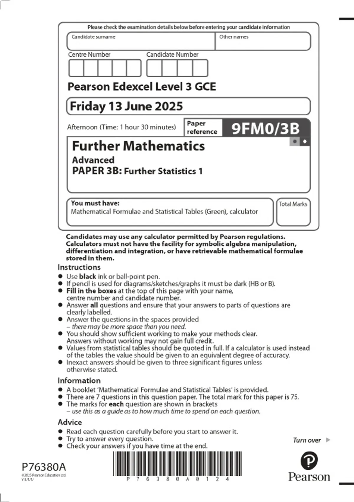 2025 Pearson Edexcel Level 3 GCE Further Mathematics Advanced PAPER 3B: Further Statistics 1Combined Question Paper and Marking Scheme