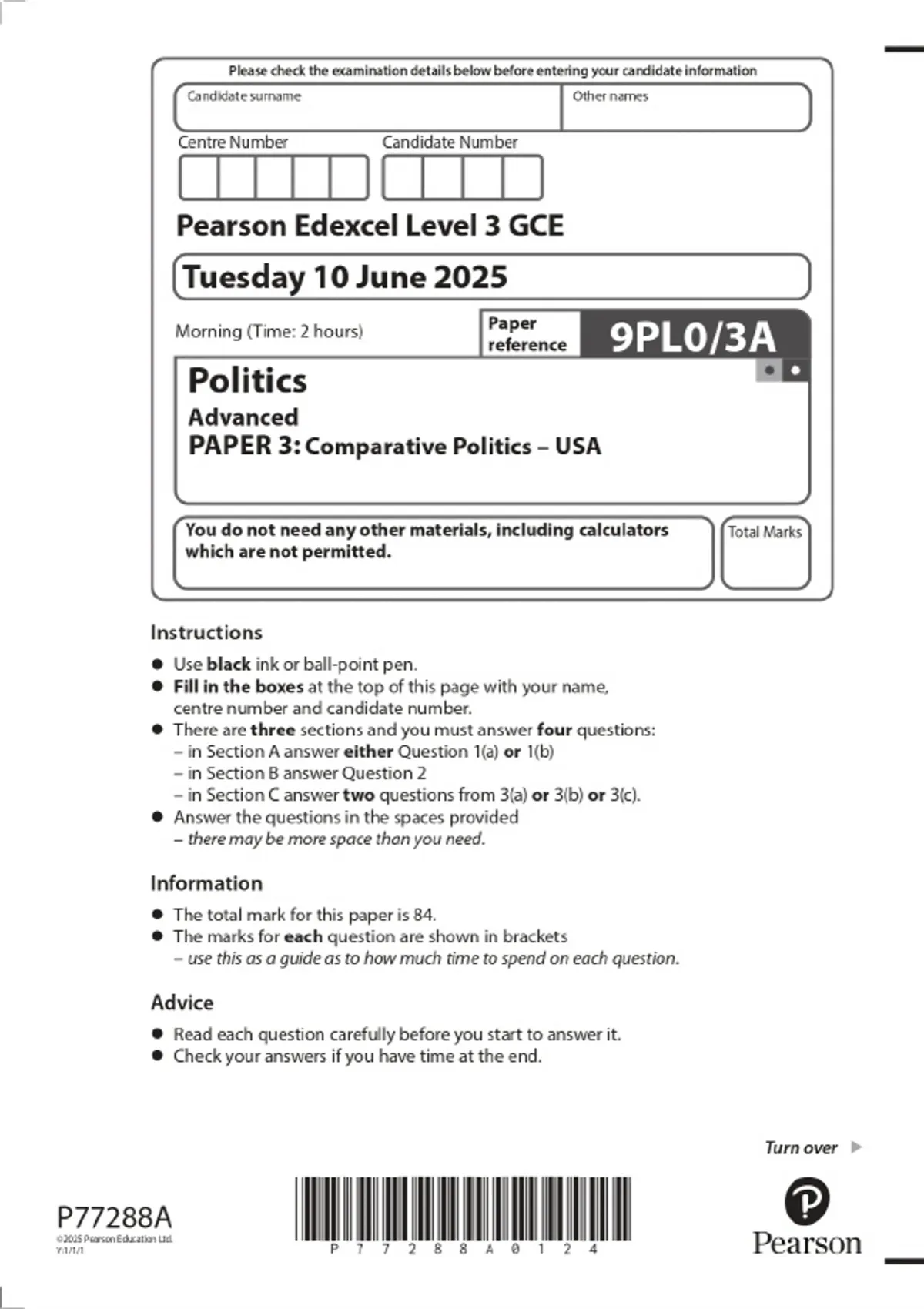 2025 Pearson Edexcel Level 3 GCE Politics Advanced PAPER 3: Comparative Politics – USA Combined Question Paper and Marking Scheme