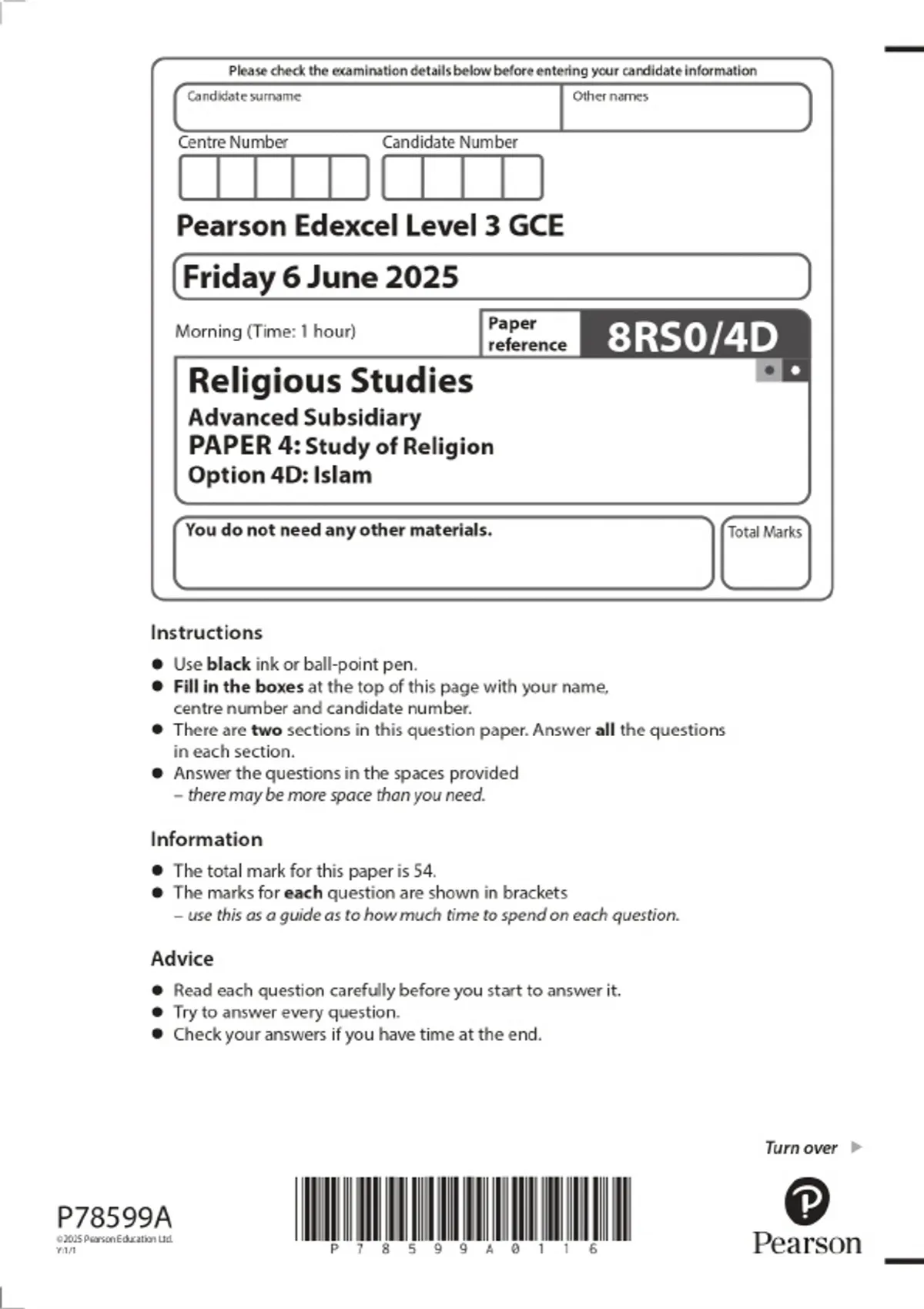 2025 Pearson Edexcel Level 3 GCE Religious Studies Advanced Subsidiary PAPER 4: Study of Religion Option 4D: Islam Combined Question Paper and Marking Scheme
