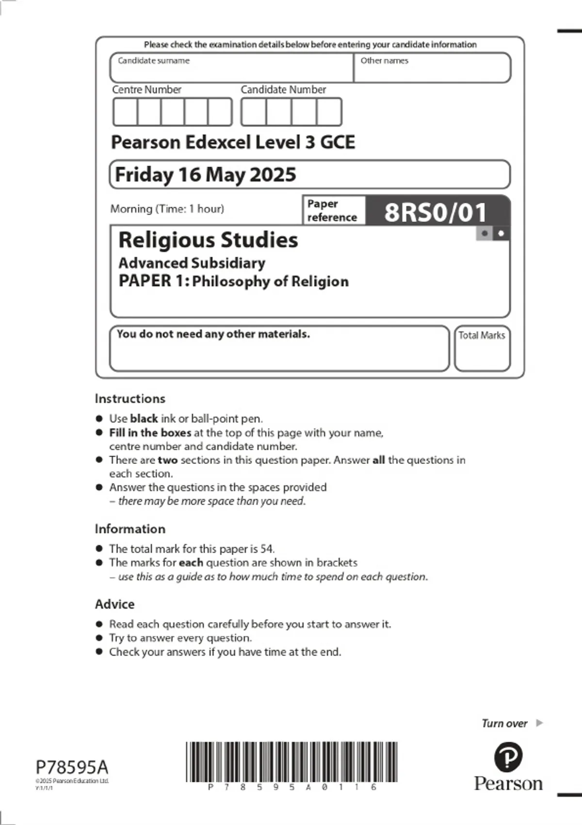 2025 Pearson Edexcel Level 3 GCE Religious Studies Advanced Subsidiary PAPER 1: Philosophy of Religion Combined Question Paper and Marking Scheme