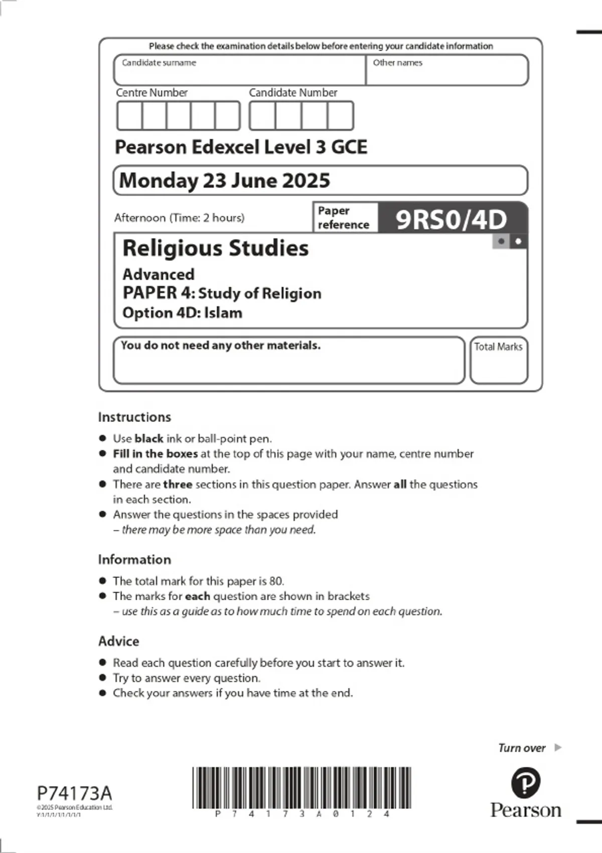 2025 Pearson Edexcel Level 3 GCE Religious Studies Advanced PAPER 4: Study of Religion Option 4D: Islam Combined Question Paper and Marking Scheme