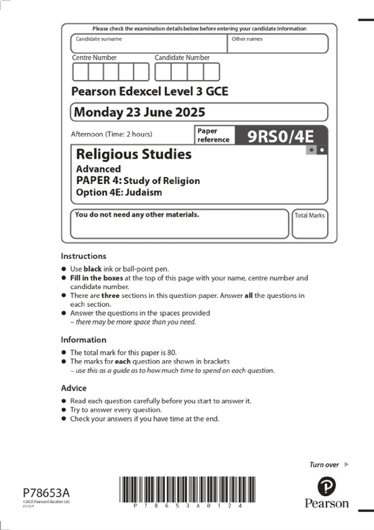 2025 Pearson Edexcel Level 3 GCE Religious Studies Advanced PAPER 4: Study of Religion PAPER 4: Study of Religion Option 4E: Judaism Combined Question Paper and Marking Scheme