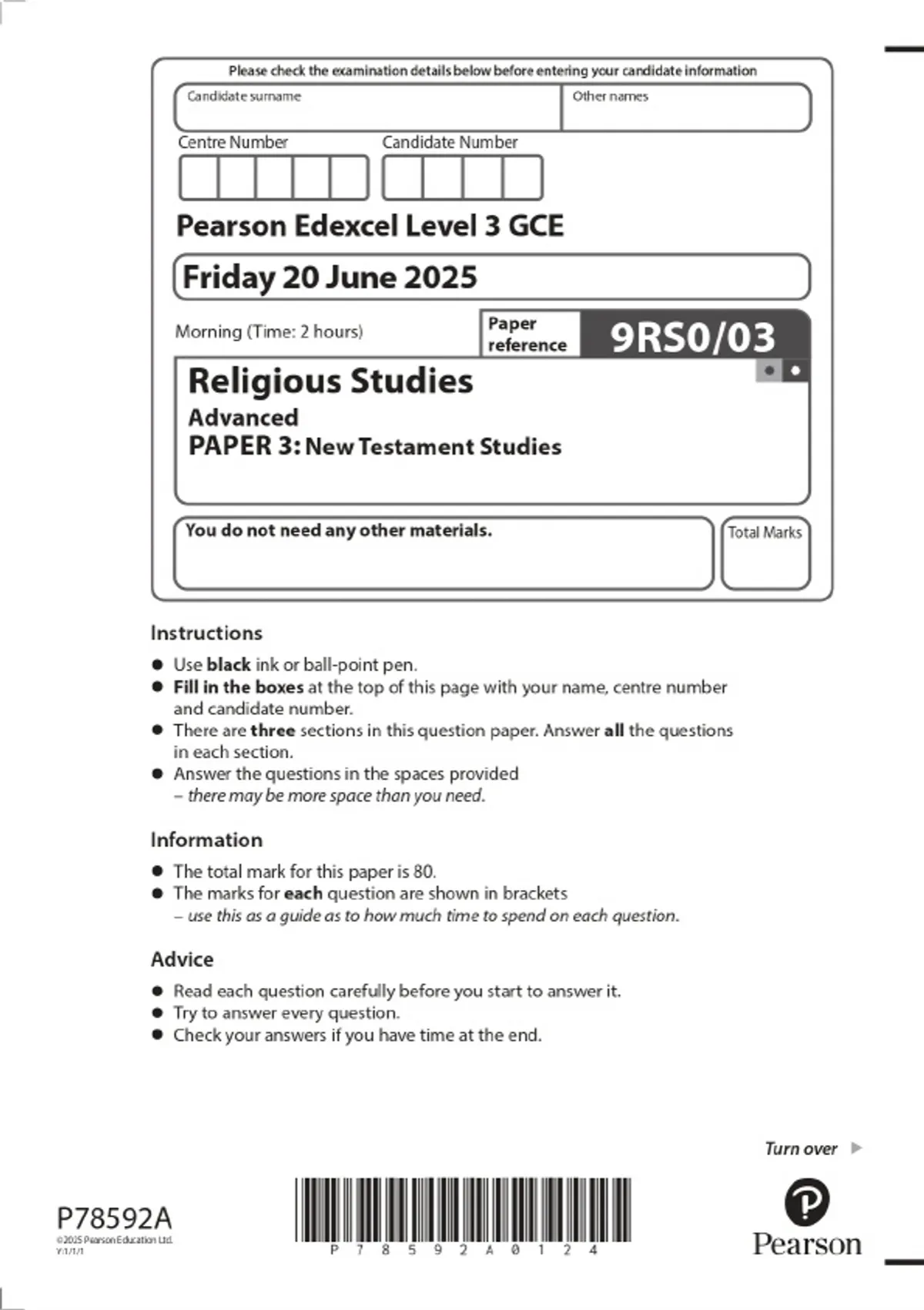 2025 Pearson Edexcel Level 3 GCE Religious Studies Advanced PAPER 3: New Testament Studies Combined Question Paper and Marking Scheme