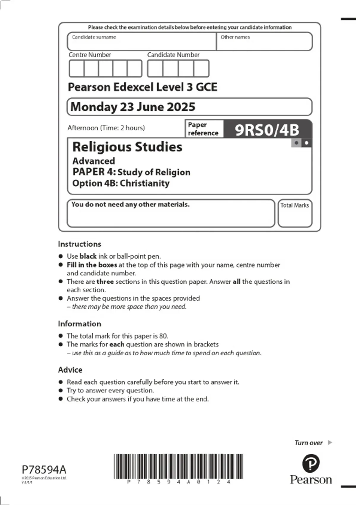 2025 Pearson Edexcel Level 3 GCE Religious Studies Advanced PAPER 4: Study of Religion Option 4B: Christianity Combined Question Paper and Marking Scheme