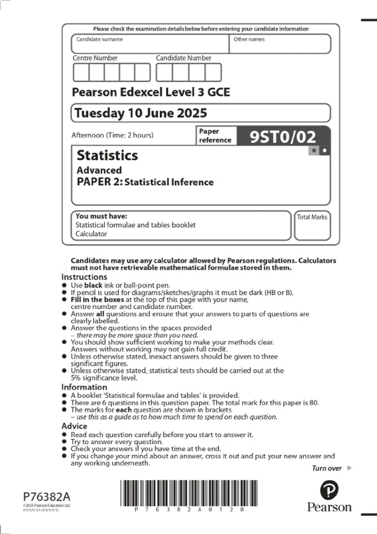 2025 Pearson Edexcel Level 3 GCE Statistics Advanced PAPER 2: Statistical Inference Combined Question Paper and Marking Scheme