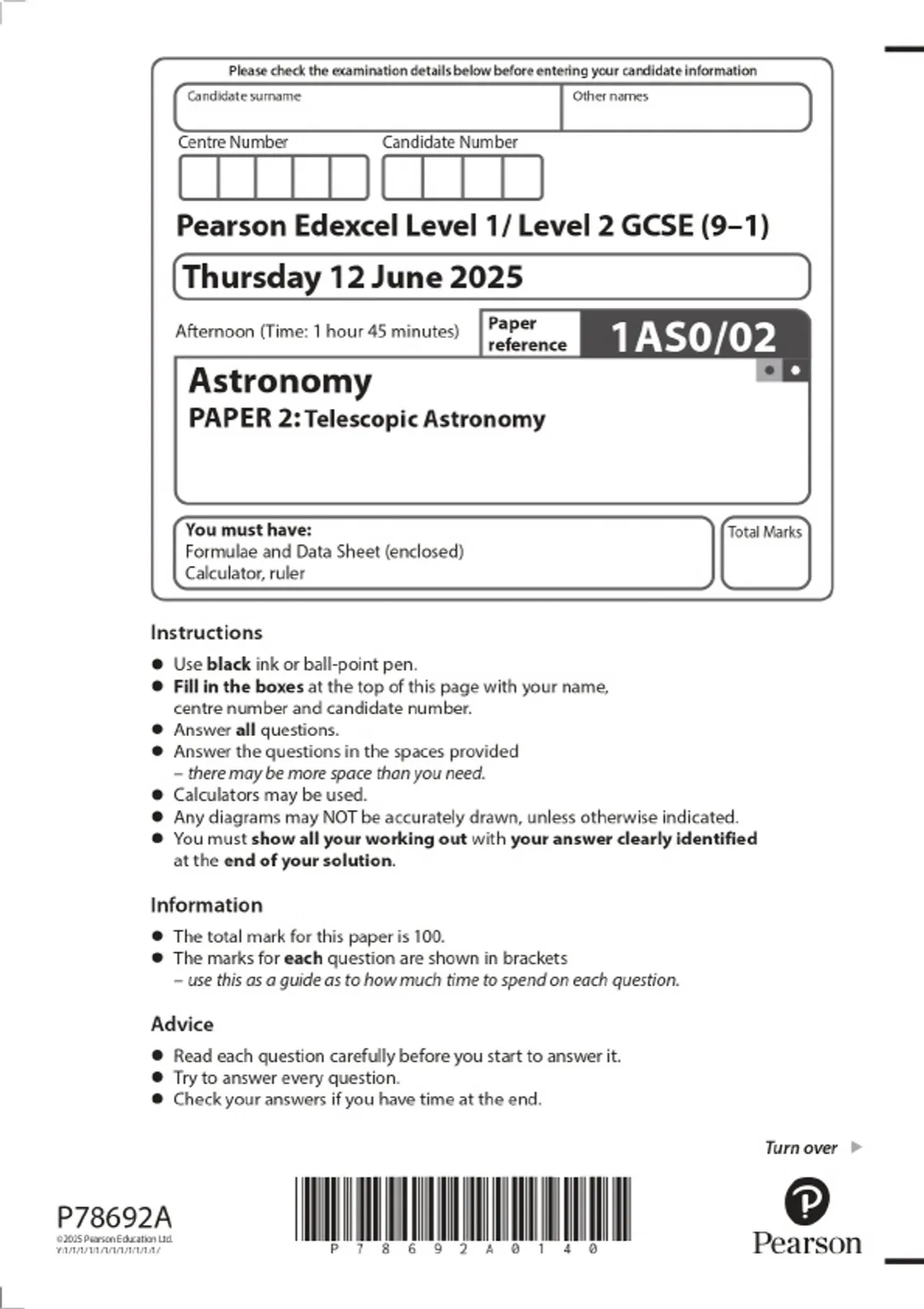 2025 Pearson Edexcel Level 1/Level 2 GCSE (9–1) Astronomy PAPER 2: Telescopic Astronomy Combined Question Paper and Marking Scheme