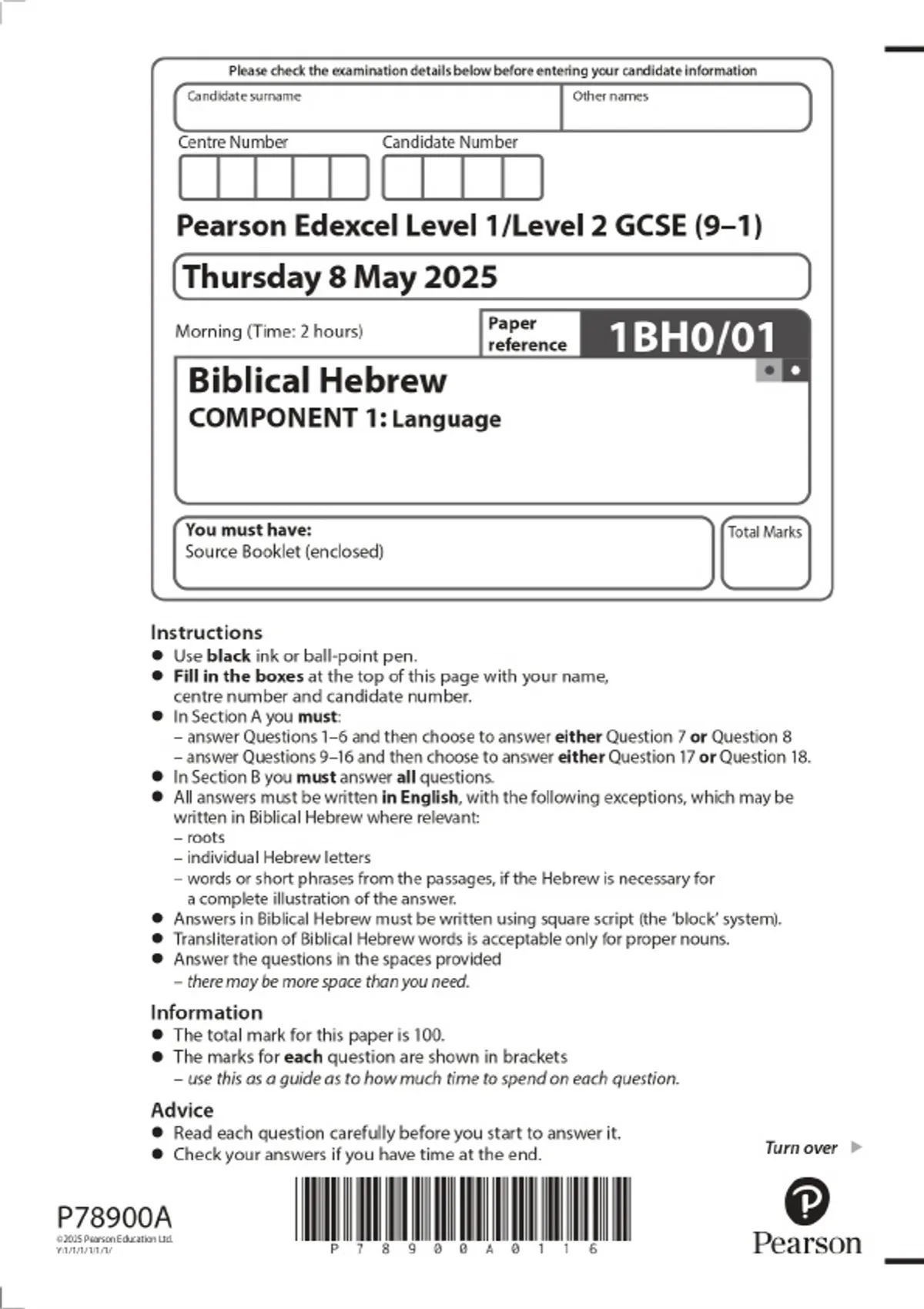 2025 Pearson Edexcel Level 1/Level 2 GCSE (9–1) Biblical Hebrew COMPONENT 1: Language Combined Question Paper and Marking Scheme