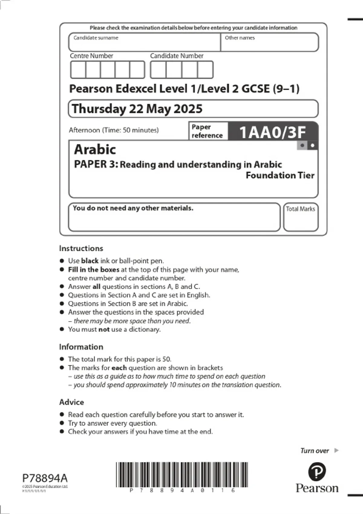 2025 Pearson Edexcel Level 1/Level 2 GCSE (9–1) Arabic PAPER 3: Reading and understanding in Arabic Foundation Tier Combined Question Paper and Marking Scheme
