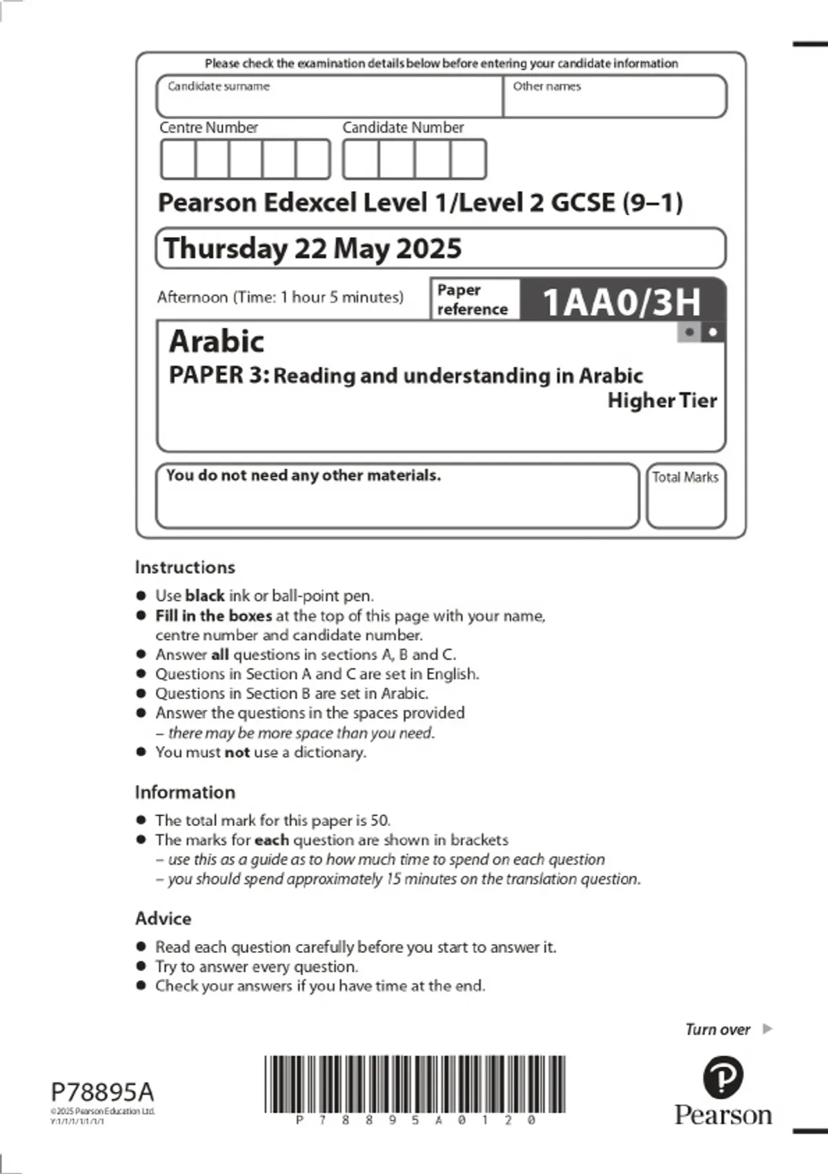 2025 Pearson Edexcel Level 1/Level 2 GCSE (9–1) Arabic PAPER 3: Reading and understanding in Arabic Higher Tier Combined Question Paper and Marking Scheme
