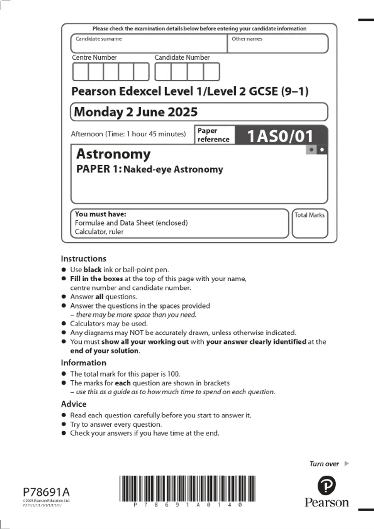 2025 Pearson Edexcel Level 1/Level 2 GCSE (9–1) Astronomy PAPER 1: Naked‑eye Astronomy Combined Question Paper and Marking Scheme