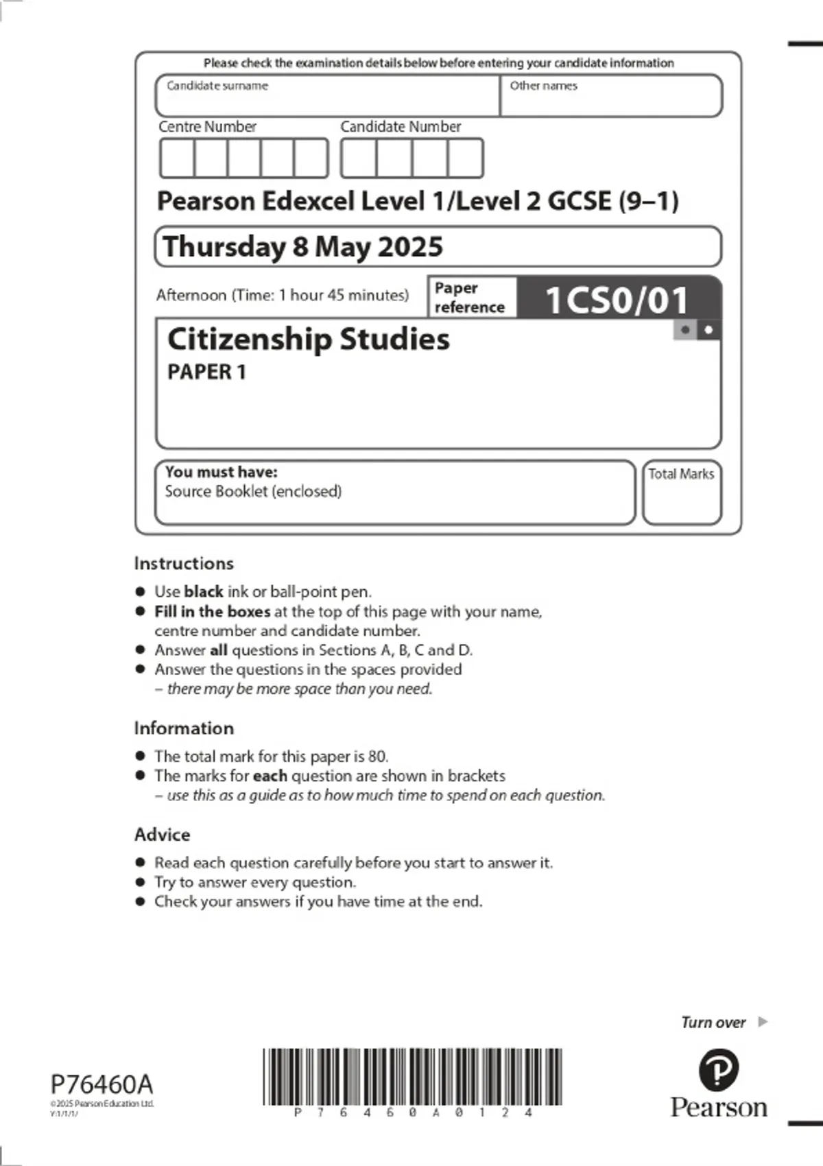 2025 Pearson Edexcel Level 1/Level 2 GCSE (9–1) Citizenship Studies PAPER 1 Combined Question Paper and Marking Scheme